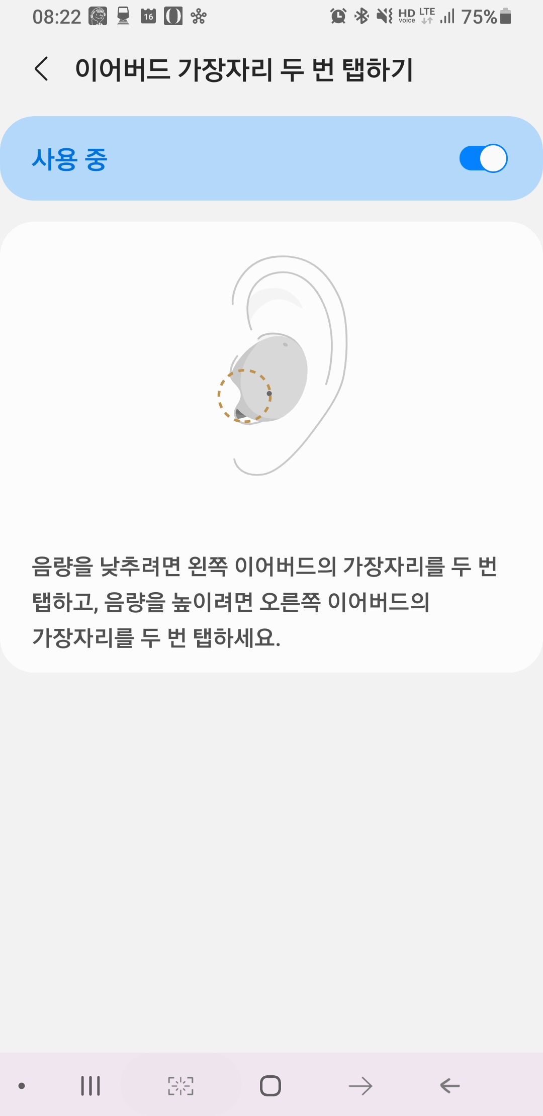 무선 블루투스 이어밴드가 유선 이어폰보다 불편한 부분 중 하나가 바로 볼륨조절 인데요. 이번 갤럭시 버즈2 볼륨조절은 이어폰 가장자리를 두 번 터치하면 조절 됩니다. 다만 매끄럽게 잘 작동하지 않네요.