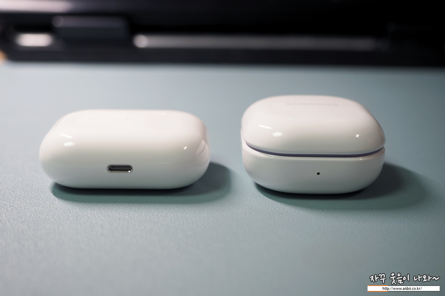 제품의 색상이나 유광처리는 상당히 비슷합니다. 갤럭시 버즈는 정사각형에 가까운, 에어팟 프로는 가로가 긴 타입입니다. 두께는 버즈가 상대적으로 조금 두껍네요