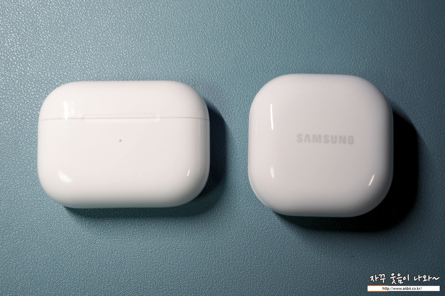 제품의 색상이나 유광처리는 상당히 비슷합니다. 갤럭시 버즈는 정사각형에 가까운, 에어팟 프로는 가로가 긴 타입입니다. 두께는 버즈가 상대적으로 조금 두껍네요