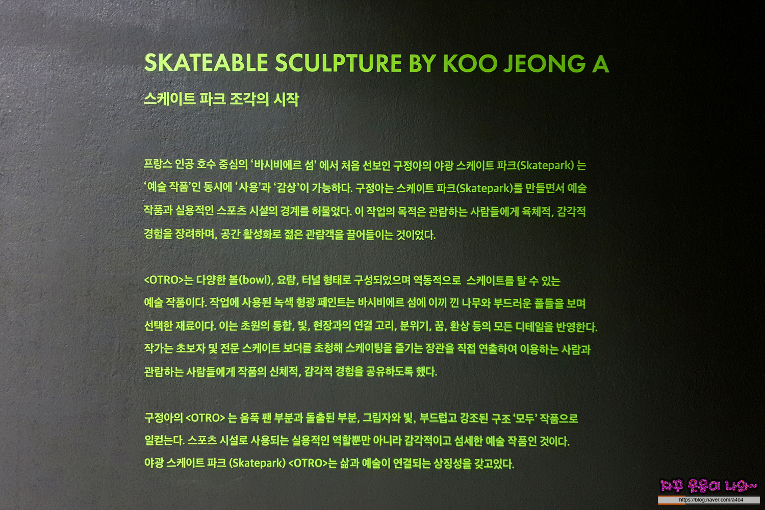 구정아 작가는 파리 퐁피두센터에서 백남준 작가에 이어 한국인으로 두 번째 개인전을 개최한 세계적인 작가로 스케이트 파그라는 일반인들에게는 조금 낮선 소재의 작품을 보여주는 전시회입니다.