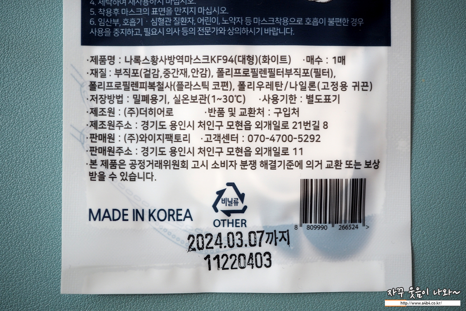 KF94 나록스 황사방역마스크는 일반 마스크 사이즈로 저와 같이 얼굴 큰 대갈장군에게는 조금 답답한 착용감을 보입니다. 일반적인 성인 분들에게 잘 맞는 사이즈를 보여줄 것으로 생각됩니다.