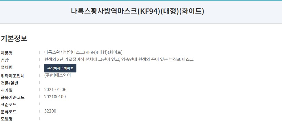 식약처 등록 제품명칭은 '나록스황사방역마스크 KF94'입니다. 흰색 대형사이즈 제품으로 올해인 21년 1월 승인된 마스크입니다. 마스크 제조사는 주식회사더히어로로 등록되어 있습니다. '나록스' 브랜드로 다양한 마스크를 생산하고 있습니다.