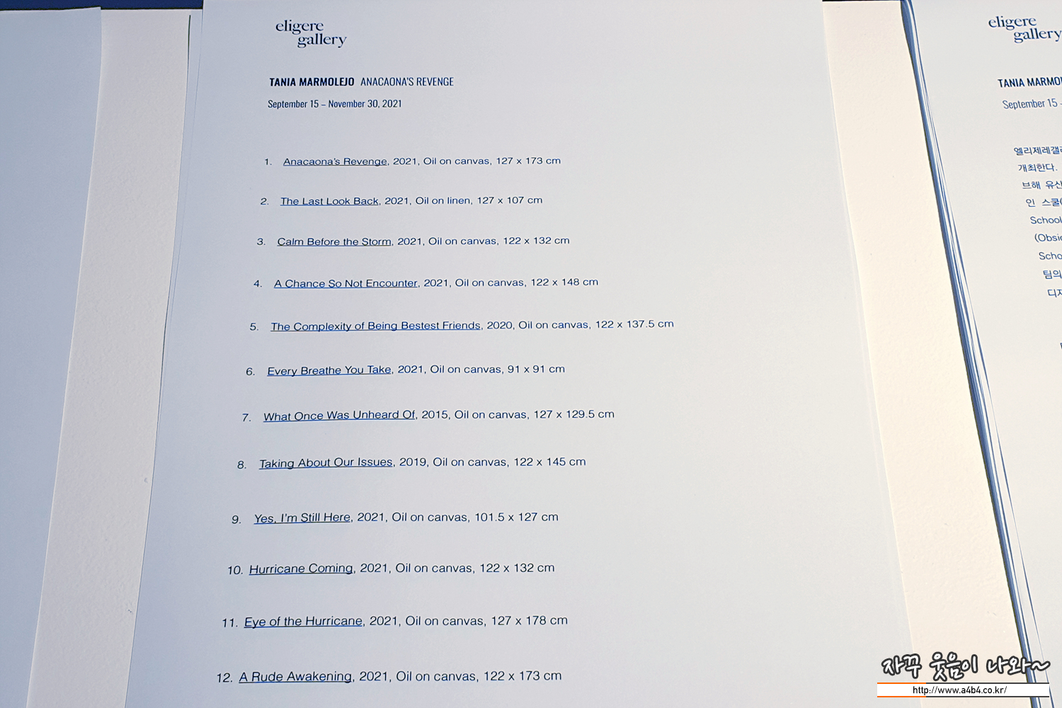 장소는 강남구 청담동에 위치한 엘리제레 갤러리(eligere gallery)에서 열리고 있으며, 매주 화요일부터~금요일까지 다음달 말일인 11월 30일까지 전시회가 진행됩니다.