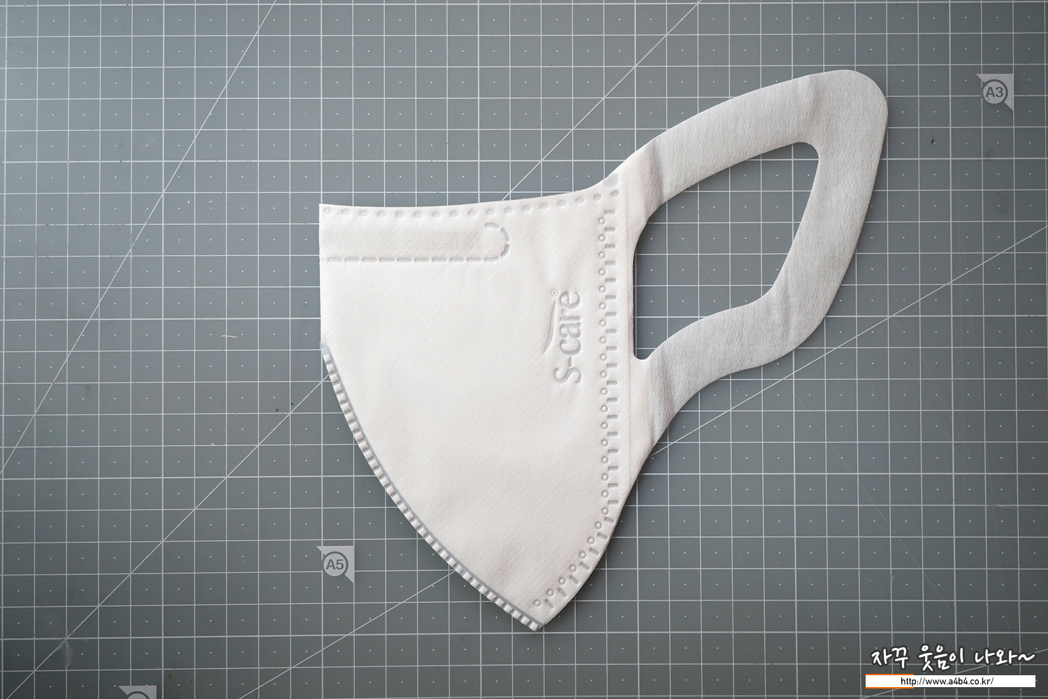 에스케어 마스크 외피는 약한 패턴 처리된 드라이한 감촉의 부직포가 적용 되었습니다. 하드한 착용감과 착용핏을 보이며, 접합부분의 선처리가 상당히 강한 느낌을 주는 제품입니다.