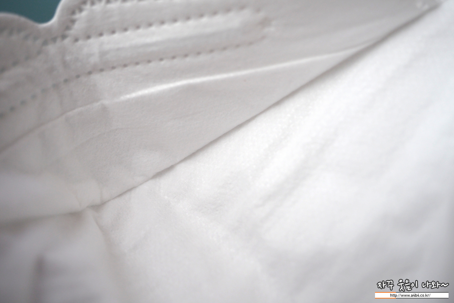 나록스 프레쉬N 마스크 KF94 내피는 드라이한 감촉의 부직포가 적용 되었습니다. 내피에 약간 보풀이 보이기는 하지만 하루 종일 사용해도 보풀로 인한 피부 트러블이나 약품 냄새는 경험하지 못했습니다. 또한 마스크 안쪽 공간 확보도 큰 문제가 없습니다.