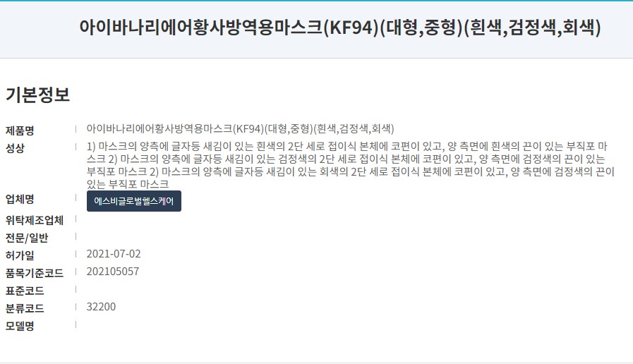 식품의략품안전처에 등록된 제품 명칭은 '아이바나리 에어 황사방역용마스크' 입니다. 사이즈는 대형과 중형이 있으며 오늘은 KF94 대형 흰색 제품으로 리뷰 진행합니다. 올해인 21년 7월에 승인된 마스크로 제조원은 '에스비글로벌헬스케어'입니다.