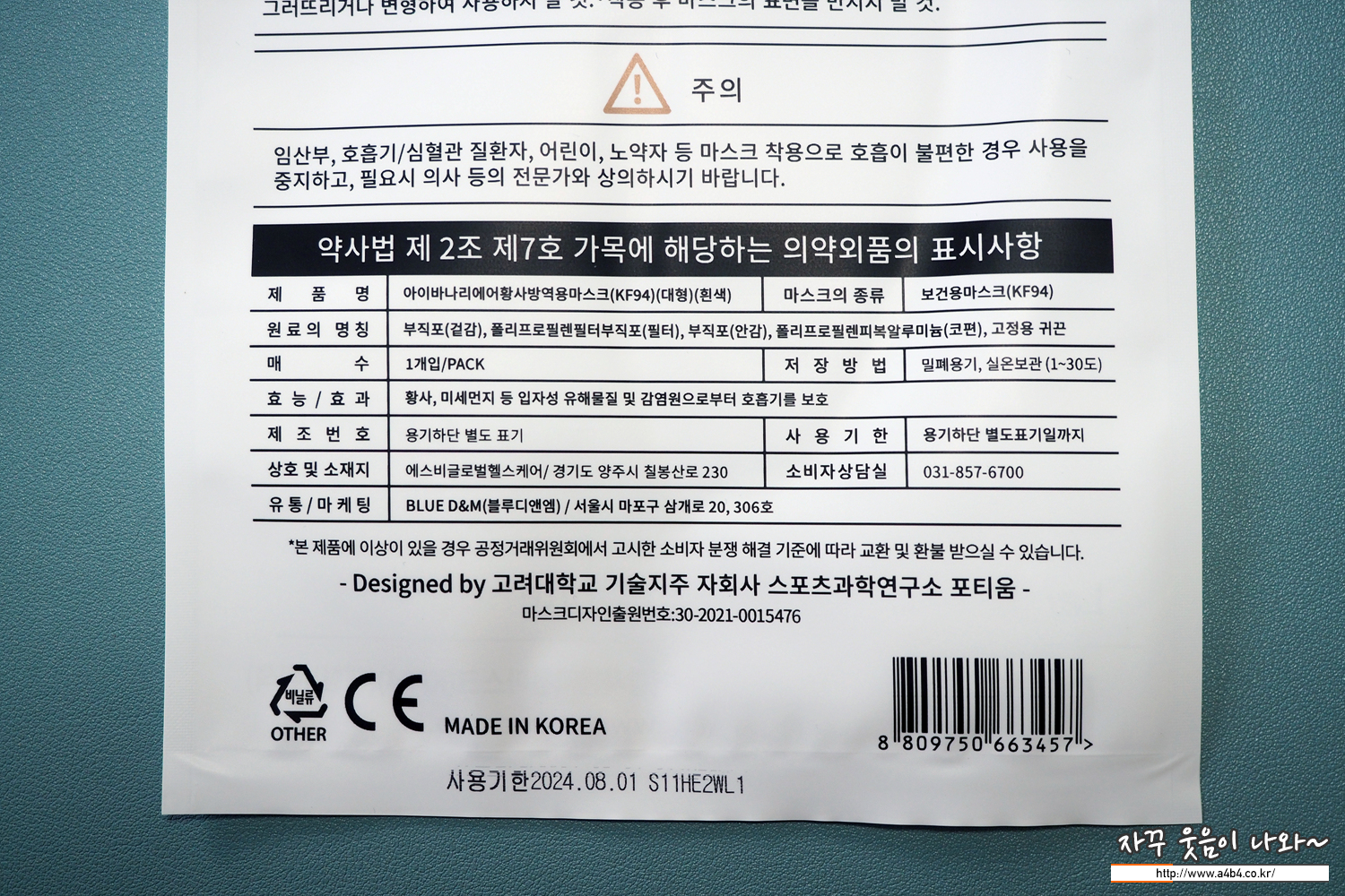 식품의략품안전처에 등록된 제품 명칭은 '아이바나리 에어 황사방역용마스크' 입니다. 사이즈는 대형과 중형이 있으며 오늘은 KF94 대형 흰색 제품으로 리뷰 진행합니다. 올해인 21년 7월에 승인된 마스크로 제조원은 '에스비글로벌헬스케어'입니다.