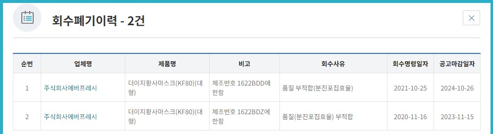 식약처에서 발표하는 불량마스크의 가장 많은 사유인 '품질부적합 - 분집포집효율'입니다. 2년 연속 적발의 영광을 얻었네요. 즉 Kf80 마스크의 기능을 충족하지 못하는 제품이라는 의미입니다.
