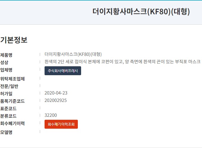 아래와 같이 식품의약품 안전처 의약품안전나라 홈페이지 고시/공고/알림 페이지에 주식회사 에버프레시 '더이지황사마스크 KF80' 불량마스크 회수/폐기 안내되어 있습니다. 충격적인 부분은 작년 11월 16일에 적발되었고 올해 10월 25일에 다시 적발된 제품입니다.