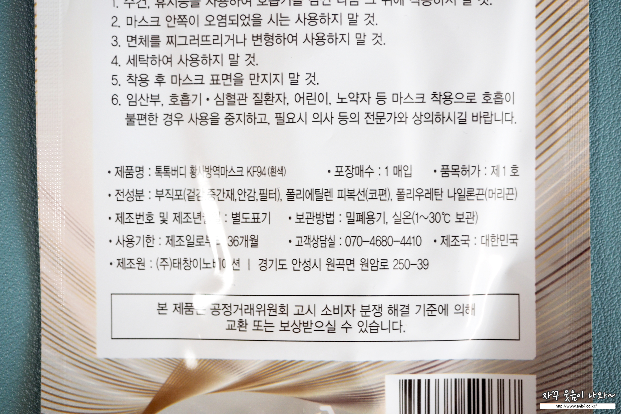 식약처 등록명은 '톡톡버디황사방역마스크 KF94'입니다. 19년에 식약처 허가된 제품으로 공적마스크 시절 저도 해당 제품을 받았던 기억이 있습니다. 마스크 제조사는 '주식회사태창이노베이션'으로 몇몇 다른 이름의 제품을 생산하고 있습니다.