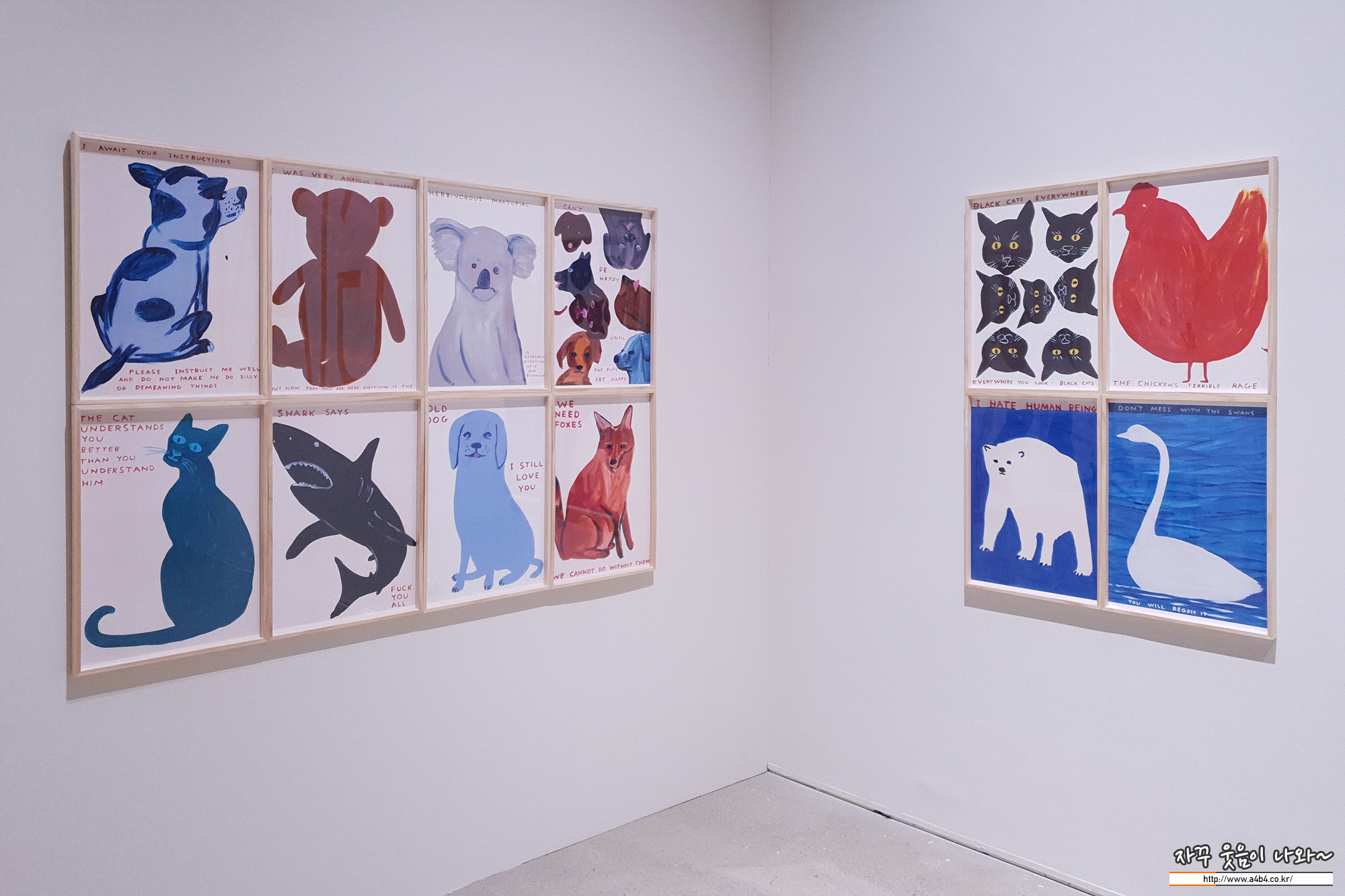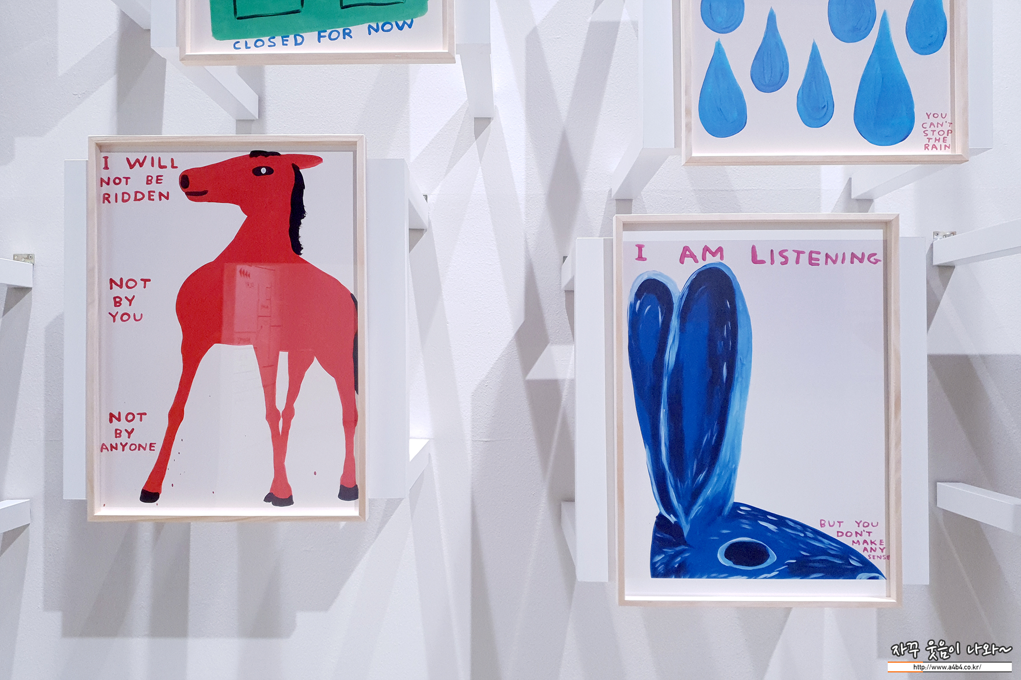 해당 공간의 작품들은 그림도 상당히 흥미롭지만 그림과 함께한 메시지도 상당해 냉소적이네요. 파란색 토끼 작품은 한장 구매해서 회의실에 비치하고 싶다는...
