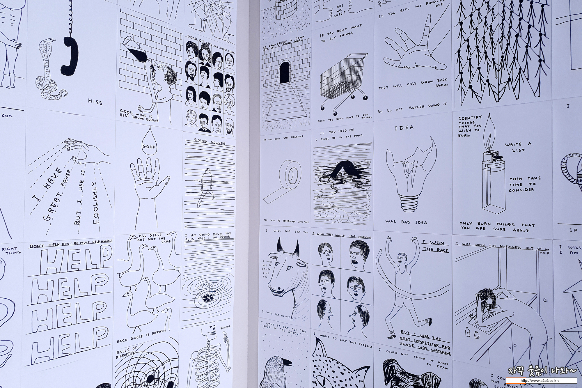 이번 작품의 특징은 위와 같이 그의 메시지와 일러스트가 하나로 구성되어 있습니다. 어려운 영어는 아니지만, 약간은 그림과 연결하여 이해하기 어려운 작품들도 있습니다.