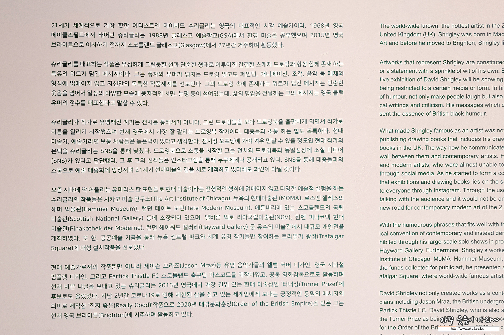 이번 데이비드 슈리글리 전시회 관람 시간은 짤게는 1시간 길게는 2시간 정도 소요됩니다. 특히 작품속의 메시지를 하나하나 이해하려 한다면, 더 많은 시간이 필요해 보이네요.