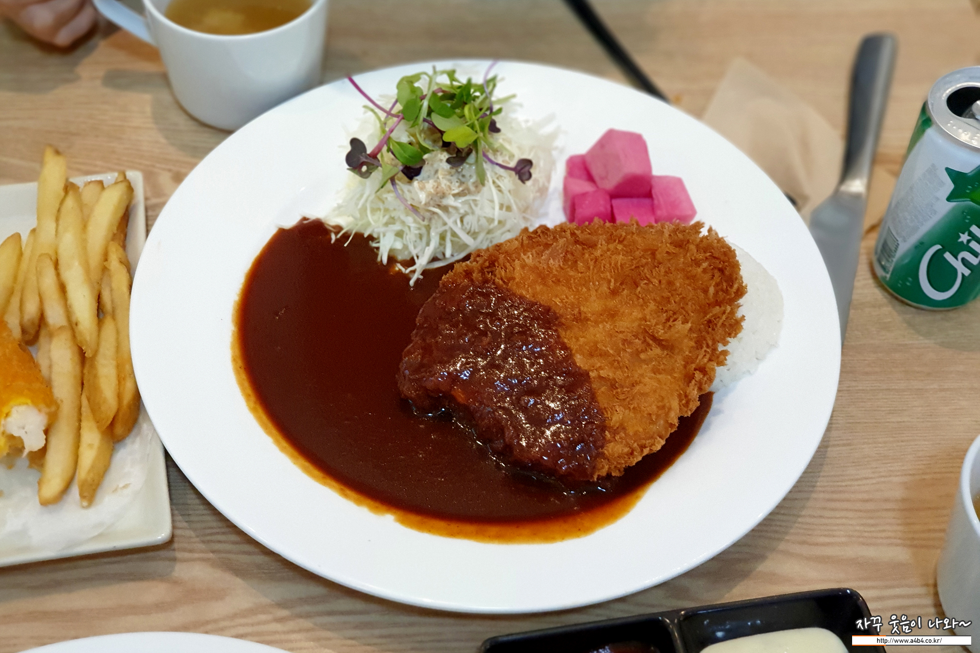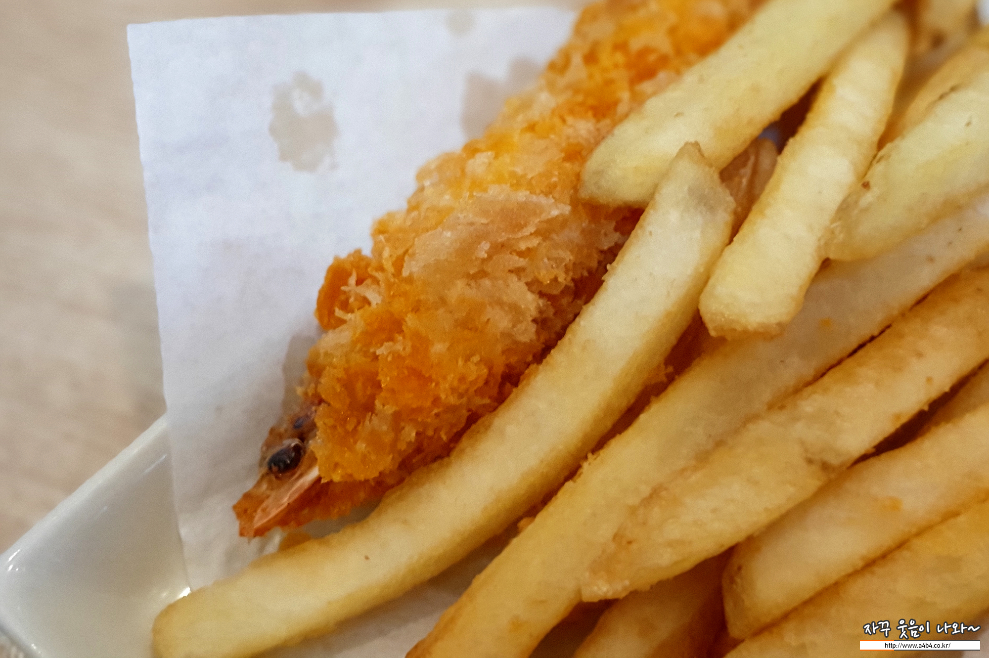 그리고 정식 메뉴에 나오는 감자튀김과 왕새우 튀김, 그리고 작은 탄산음료가 캔으로 나옵니다.