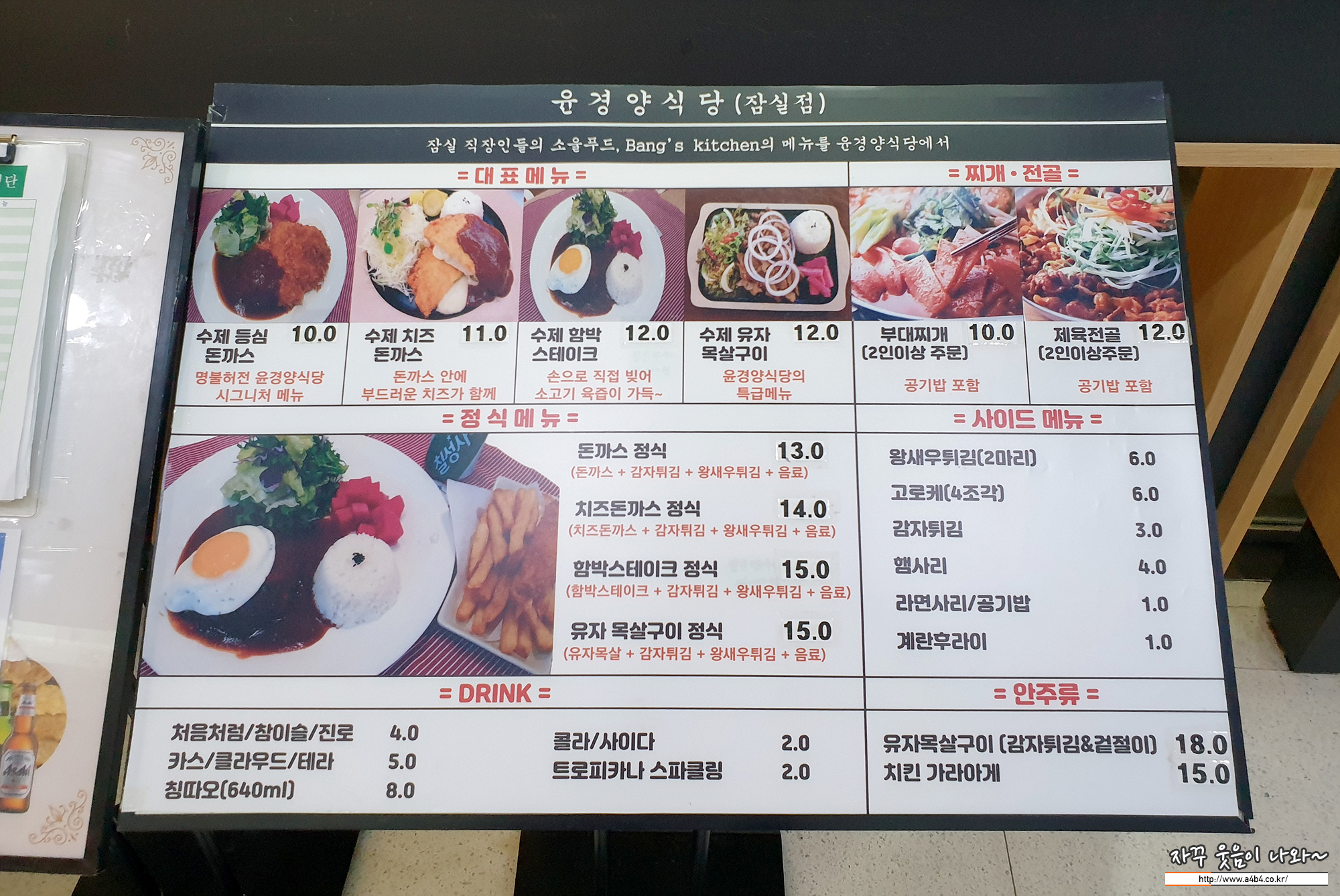역시 대표메뉴는 돈까스와 함박스테이크, 그리고 부대찌게 등 술안주 음식들이 준비되어 있습니다.