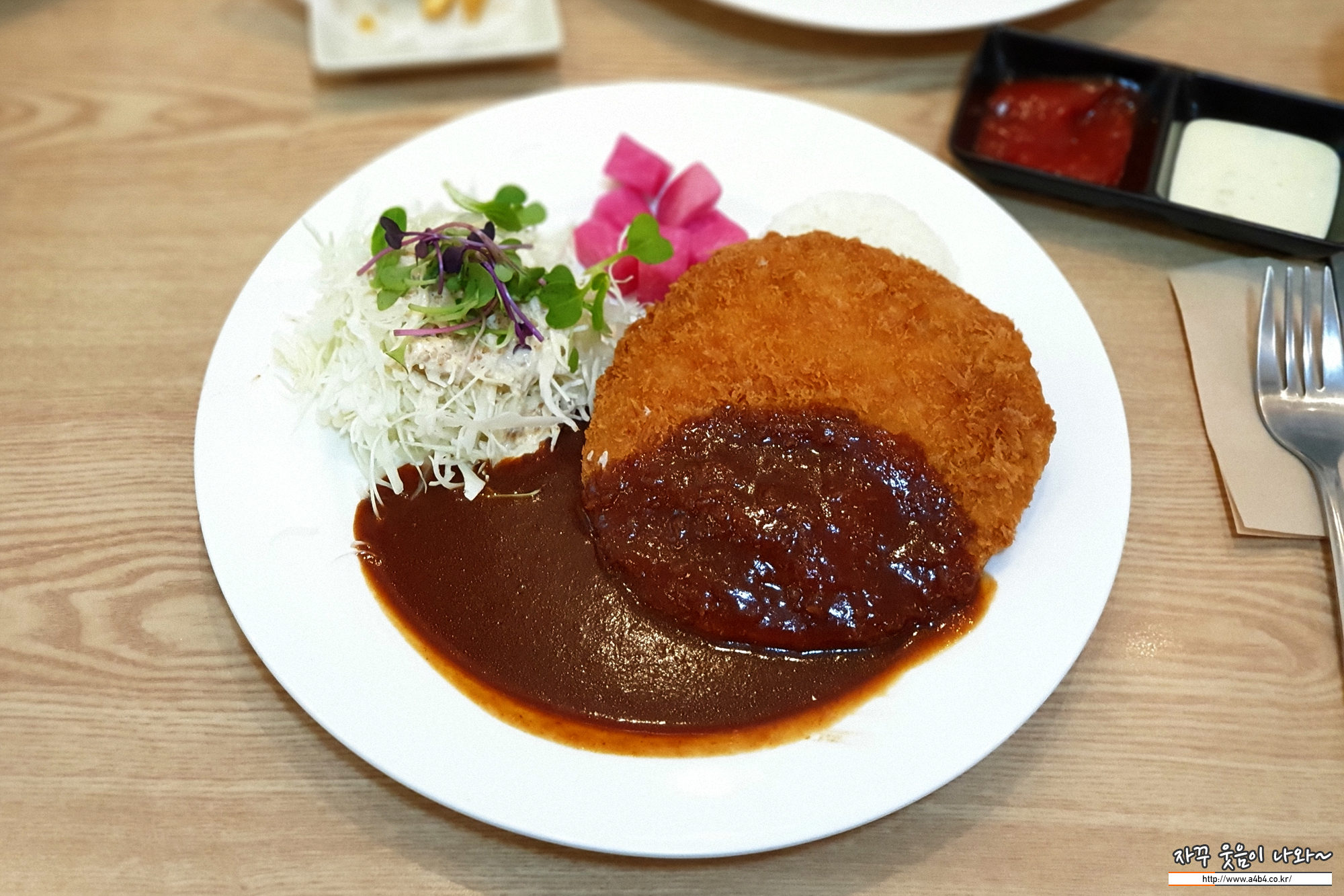등심 돈까스답게 쫄깃한 식감을 보여줍니다. 돈까스 소스는 일반적인 옛날 돈까스 소스를 생각하면 됩니다. 양은 상당히 많네요. 먹보가 먹기에도 충분한 양을 보여줍니다.
