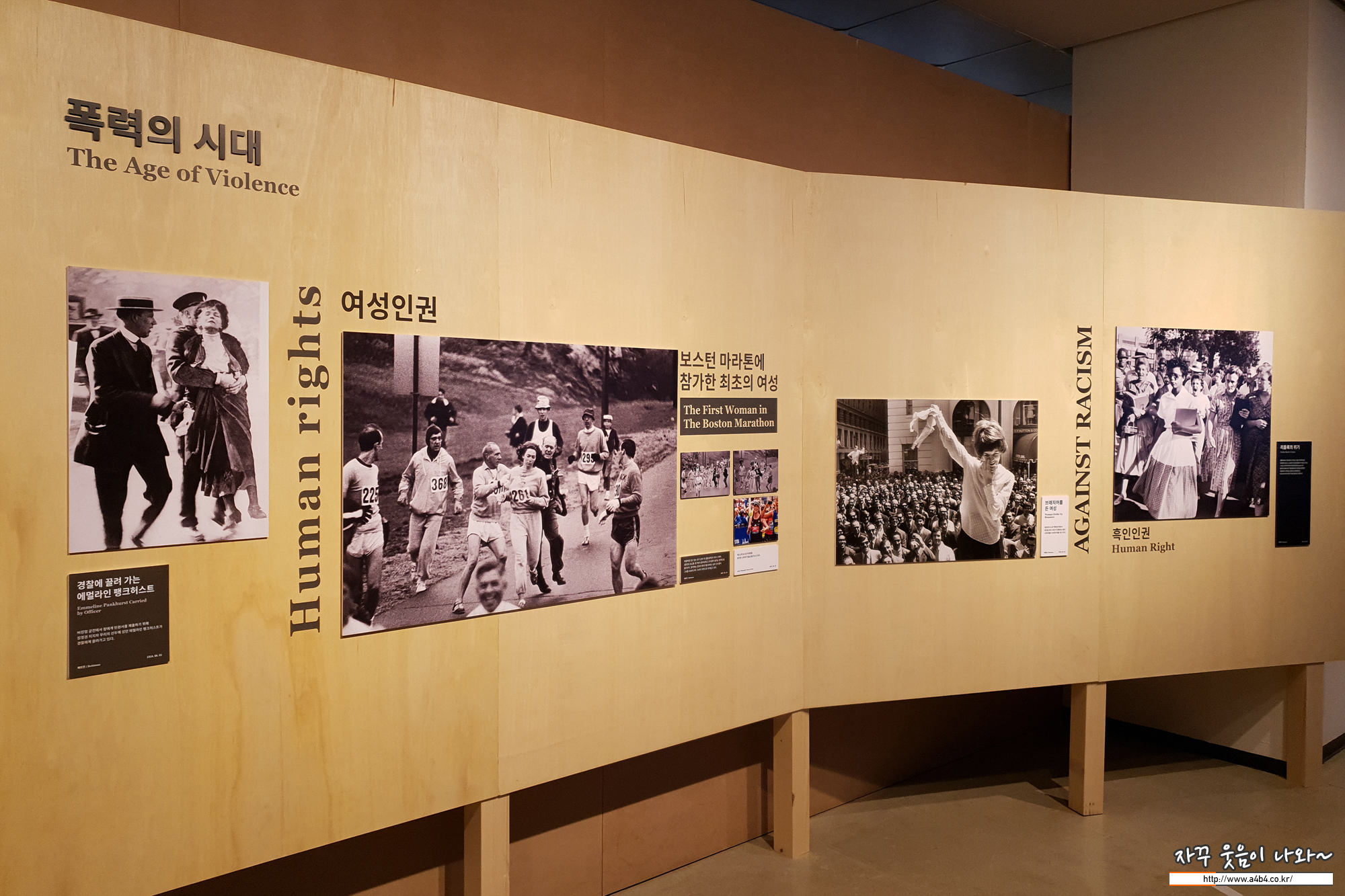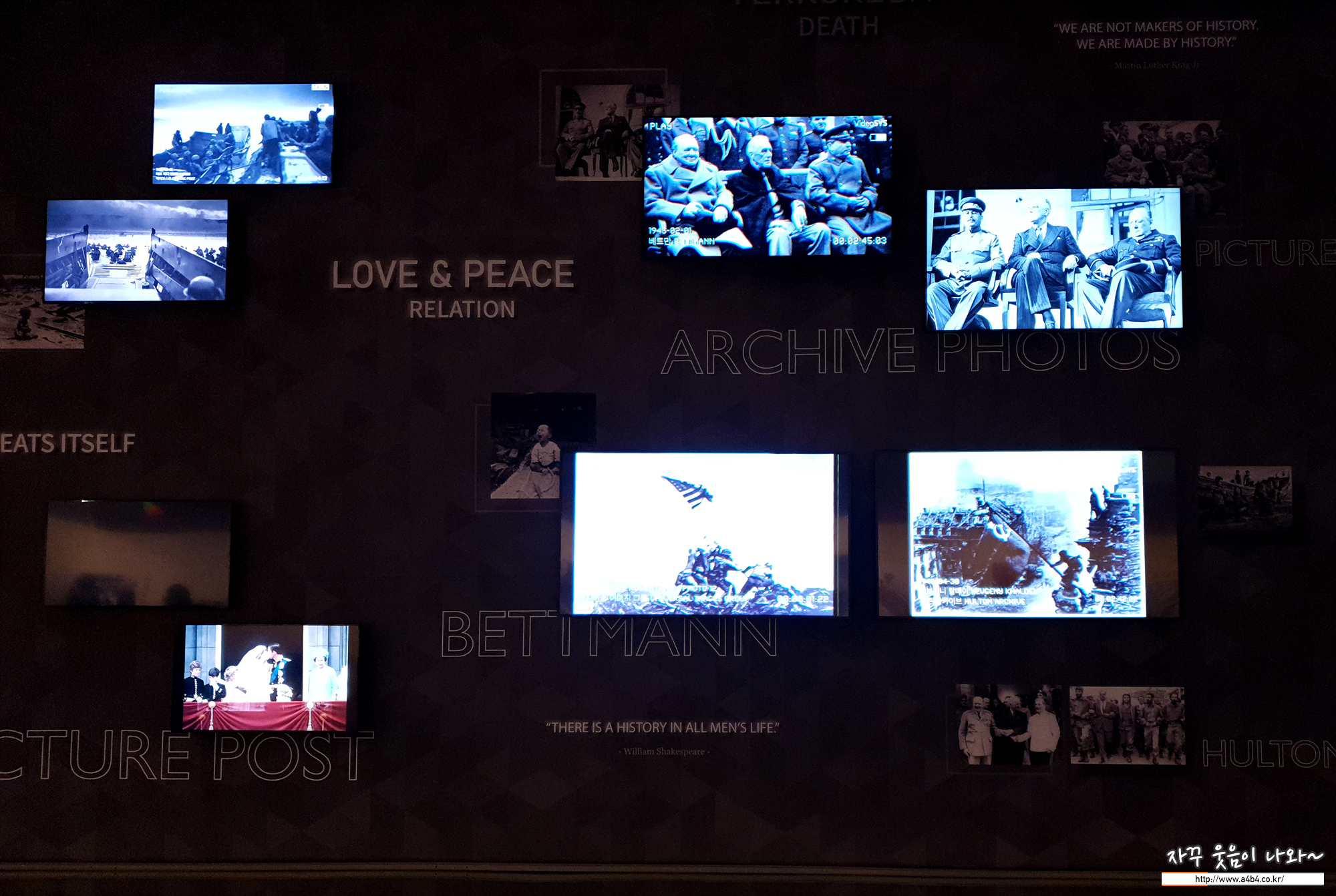 먼저 전시장 왼쪽에 위치한, 역사적인 순간과 인간과 인간 투쟁의 역사를 주제별로 구성한 공간입니다.