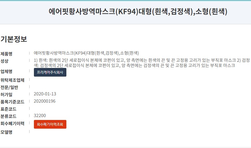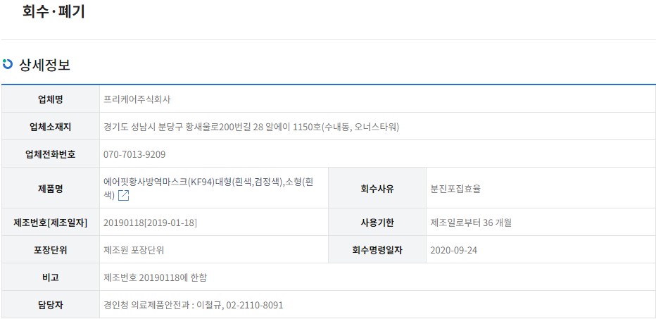 불량마스크 적발 및 회수 사유는 분집포집효율입니다. KF94 보건용 마스크 역할을 하지 못하는 불량 제품이라는 의미입니다. 아마 필터 성능이 저하 되었거나 불량품이 사용되었겠죠