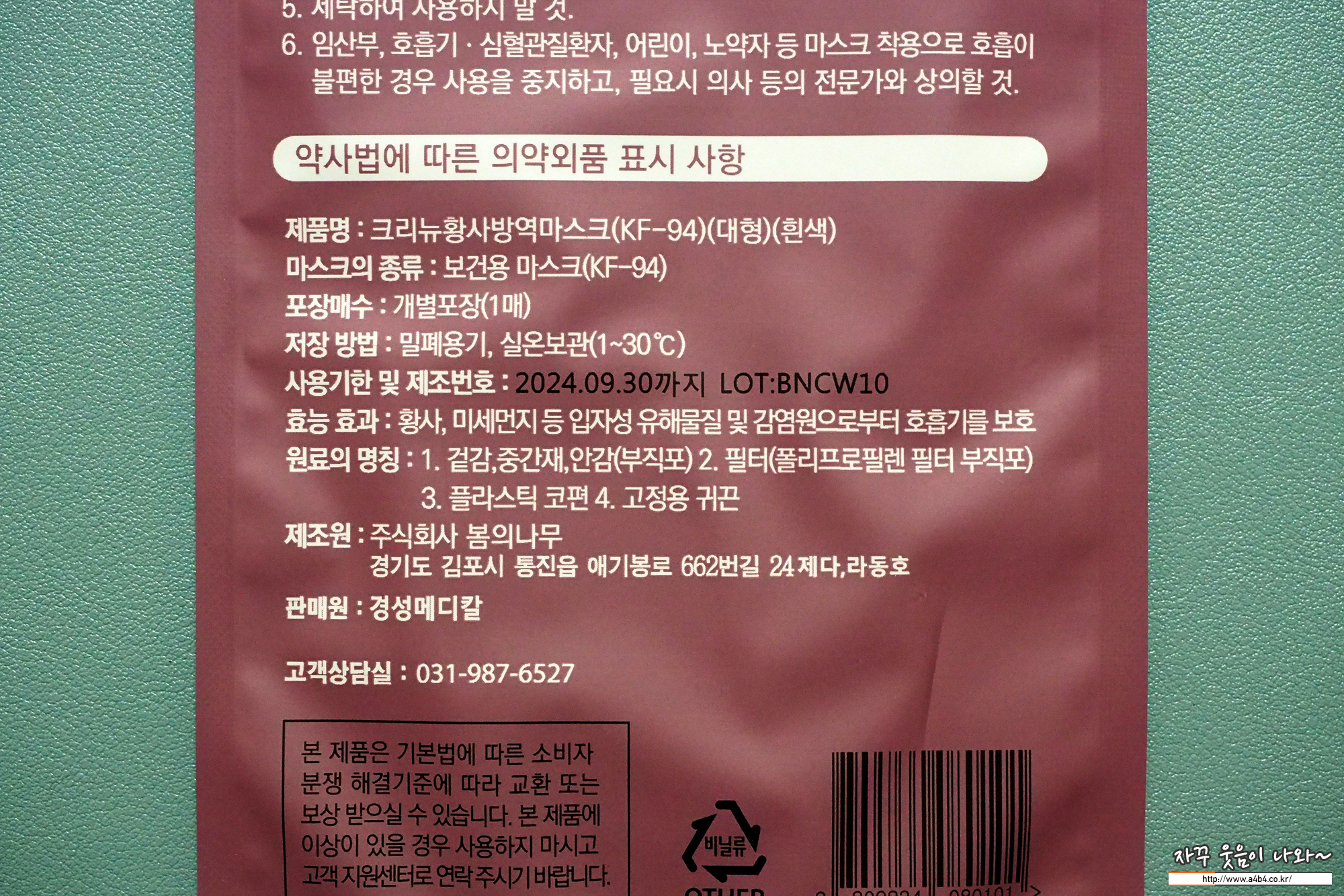 식약처 등록 제품명은 '크리뷰황사방역마스크 (KF-94)'입니다. 대형과 소형 사이즈 / 흰색 제품입니다. 작년인 21년 허가된 마스크로 마스크 제조원은 주식회사 봄의 나무로 등록되어 있습니다.