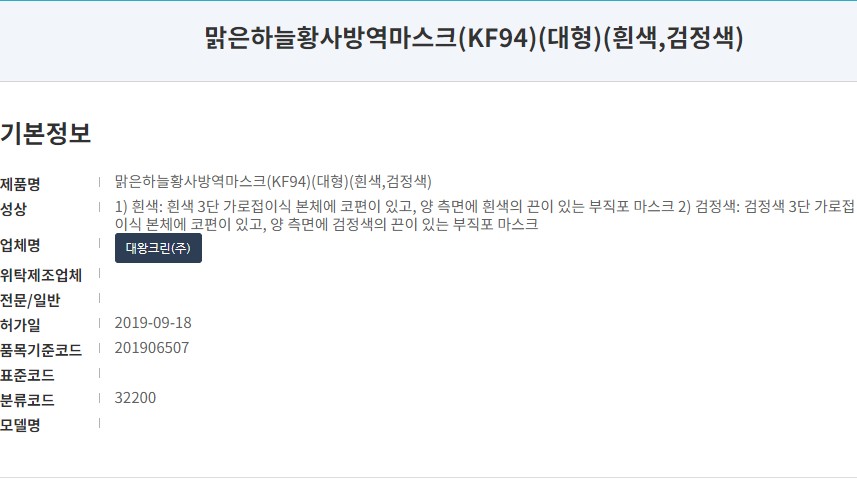 식품의약품안전처 의약품안전나라에 등록된 제품명칭은 '맑은하늘 황사방역마스크 (KF94)'입니다. 사이즈는 대형 블랙과 화이트 색상이 있으며, 마스크 제조사는 대왕크린(주)입니다. 19년에 허가된 마스크로 '맑은하늘' 브랜드로 다양한 타입의 제품을 생산하고 있습니다.