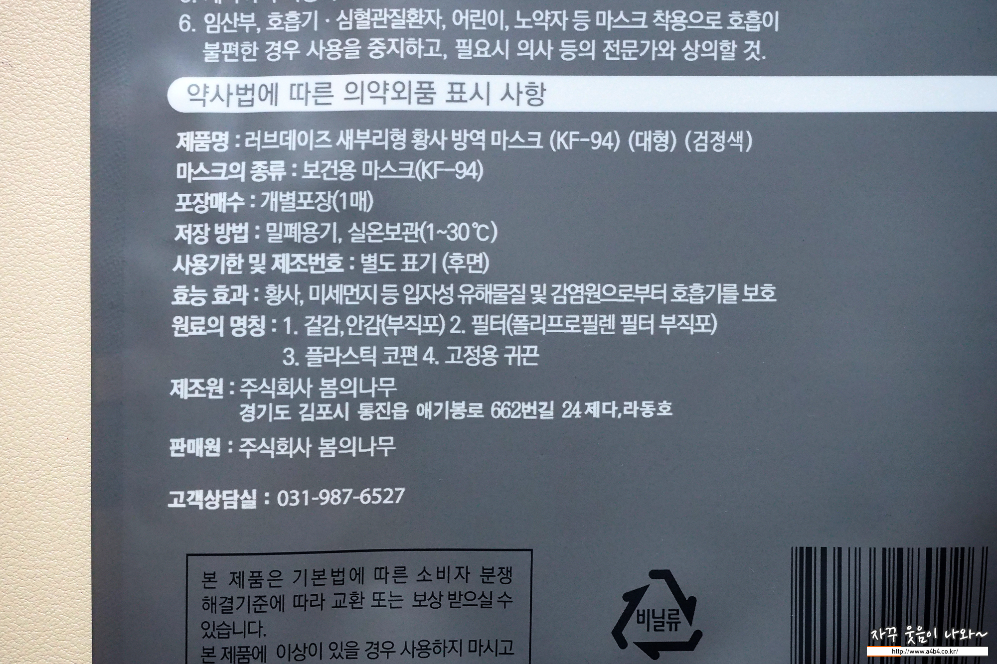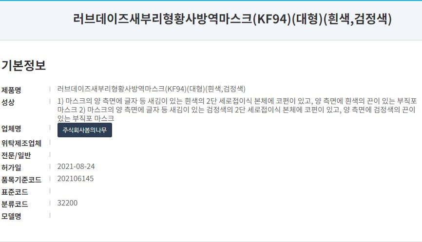 식품의약품안전처에 등록된 제품명은 '러브데이즈 새부리형 황사방역마스크'입니다. KF94 대형사이즈로 색상을 화이트와 블랙 두 가지 색상이 있습니다. 제조사는 주식회사봄의나무로 작년인 21년 8월 승인된 제품입니다.