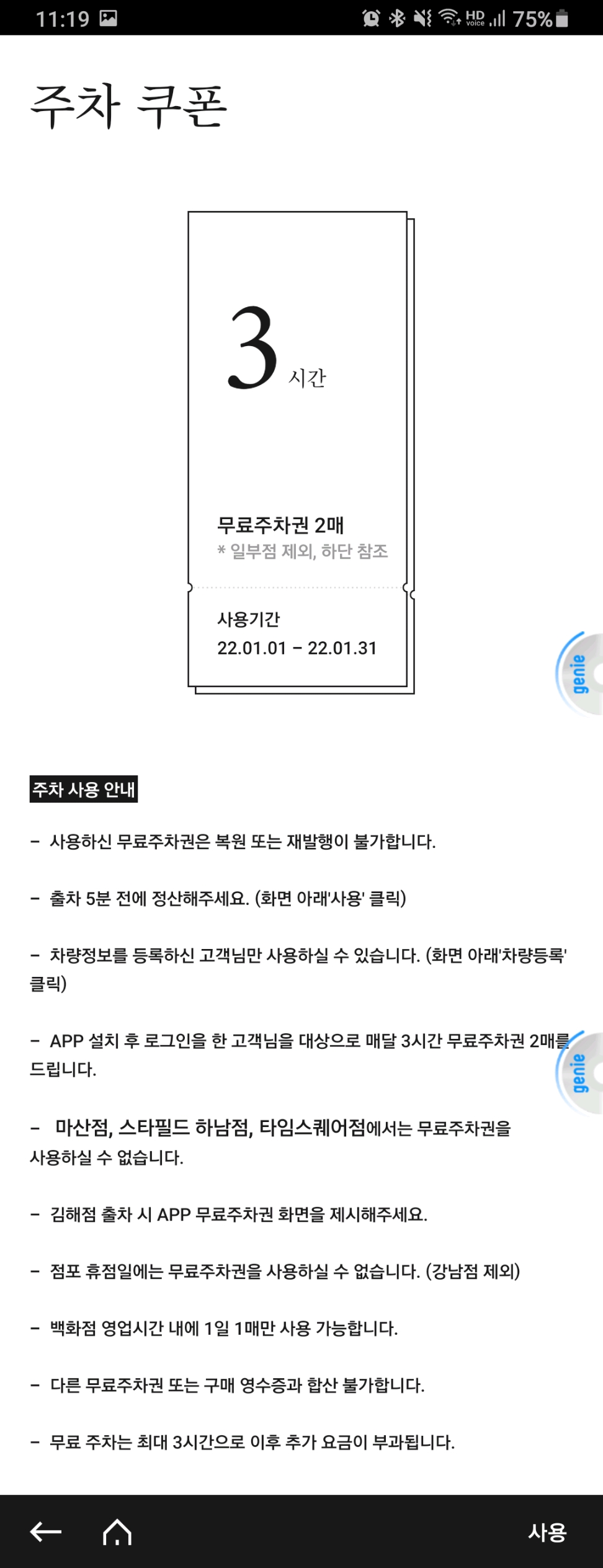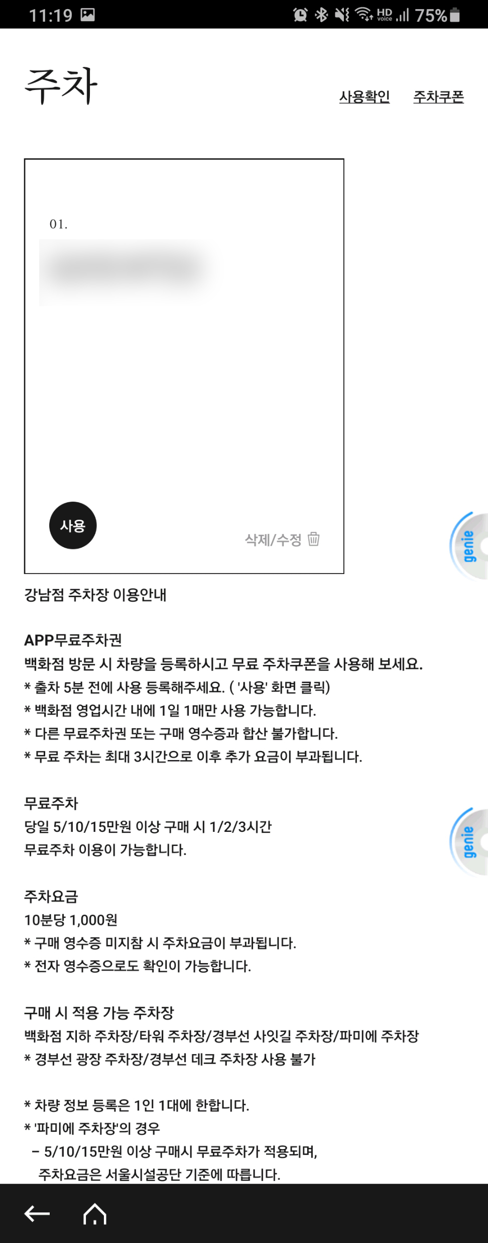 참고로 다른 무료 주차권과 합산이 불가합니다. 3시간 이내에 출차하셔야 추가 주차요금 부담이 없습니다.