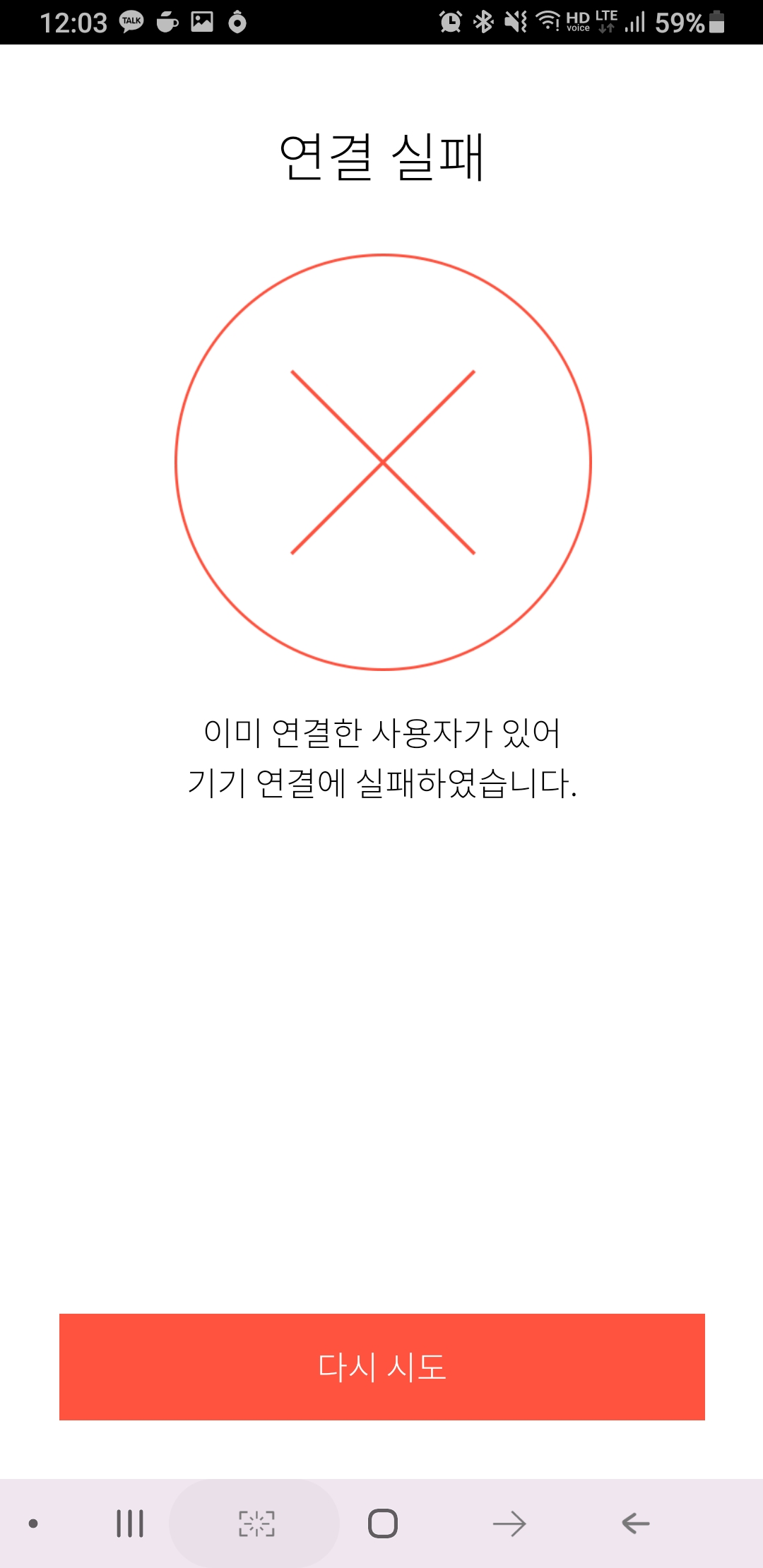 특히 '이미 기기를 연결한 사용자가 있어 기기연결에 실패하였습니다.' 라는 어이없고 짱나는... 방금 전까지 잘 사용햇는데, 폰 초기화 하고 앱 새로 설치했다고 이런 상황이...
