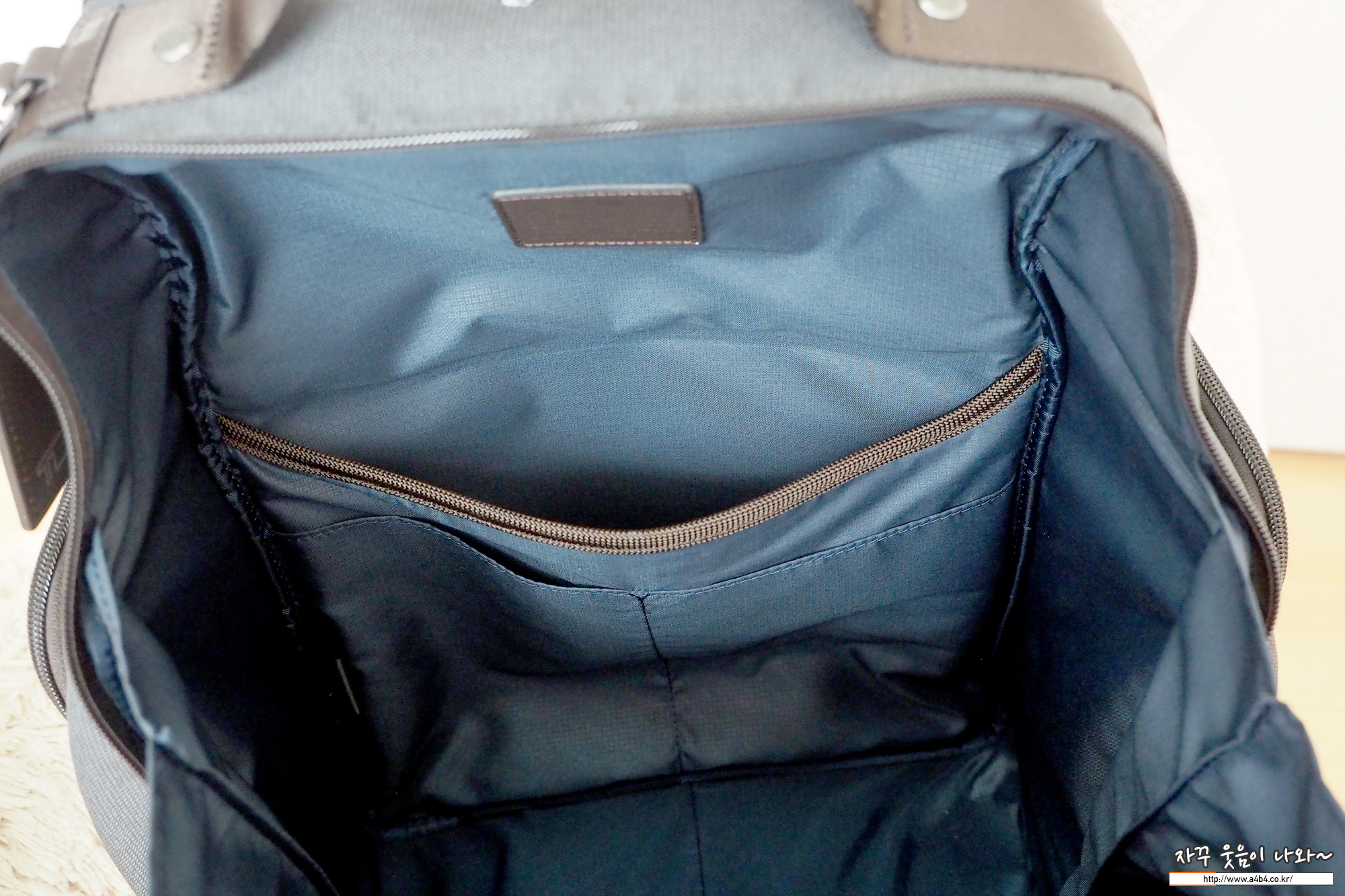 아래에는 두 개의 수납공간이 있으며, 맨 하단은 가죽이 지퍼를 덮는 방식으로 지퍼 열기 힘듭니다. 약간의 귀중품 보관하기에 알맞아 보이네요.