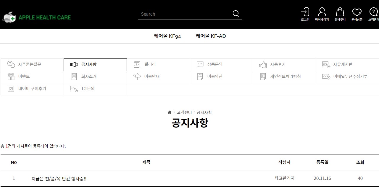 또 하나 아쉬운 부분은 식약처에 불량마스크가 적발되면 타사의 경우 홈페이지나 쇼핑몰에 해당 사실을 공지하고 보통 회수 및 고객문의를 진행하는데, 애플헬스케어 홈페이지와 네이버 쇼핑몰에는 해당 내용을 찾아볼 수 없네요