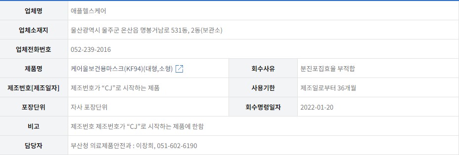 식약처에서 발표하는 불량마스크로 회수, 폐기 명령이 내려진 애플헬스케어의 케어올 마스크 소식입니다.