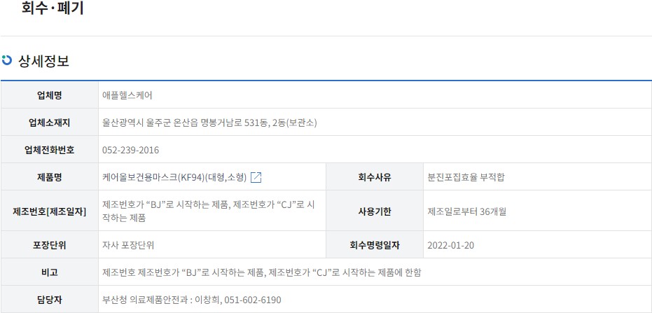식약처에서 발표하는 불량마스크로 회수, 폐기 명령이 내려진 애플헬스케어의 케어올 마스크 소식입니다.