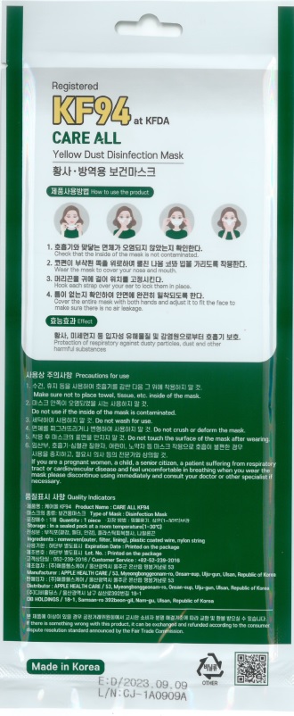 KF94 Care All 황사방역용 보건마스크 패키지와 모양은 사진과 같습니다.