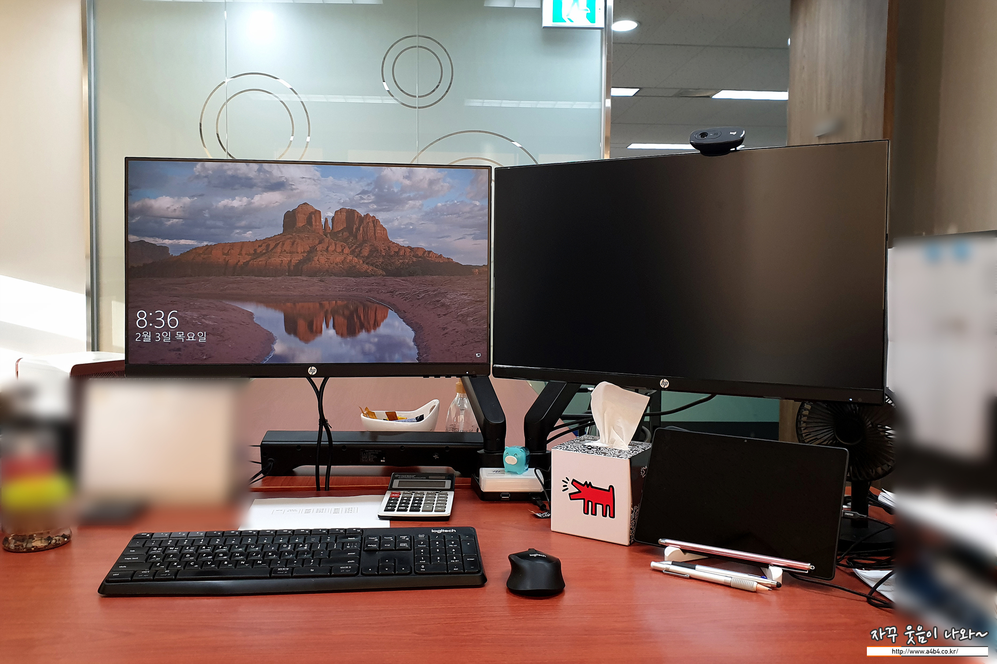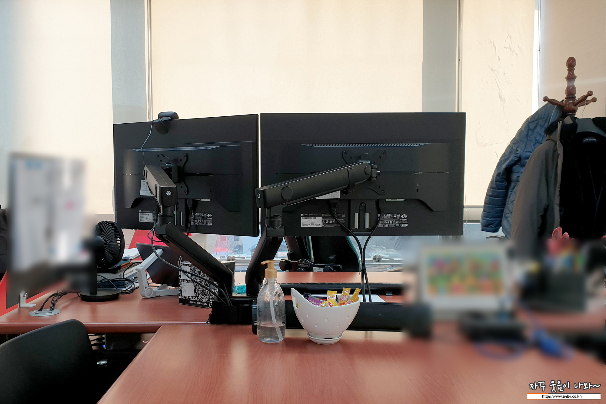 이렇게 회사에서는 루나랩 듀얼 모니터암 거치대를 이용하여 두 개의 모니터를 세팅합니다.