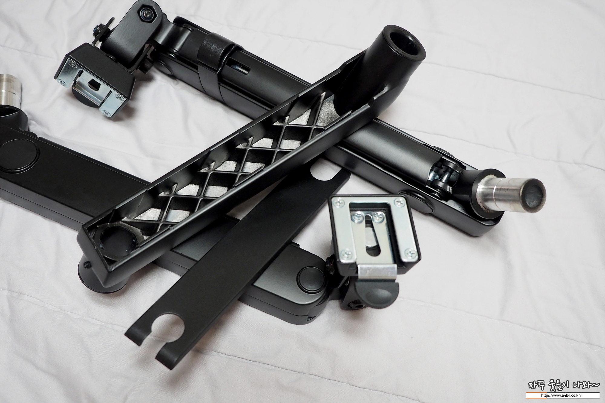 모니터 암은 각각 2개의 암으로 구성되어 있으며, 케이블 정리홀더가 가능하게 구성되어 있습니다. 베사판과 분리되어 있며, 홈이 있어 모니터 장착이 가능합니다. 상당히 튼튼하게 만들어저 있다는... 무게감도 묵직...