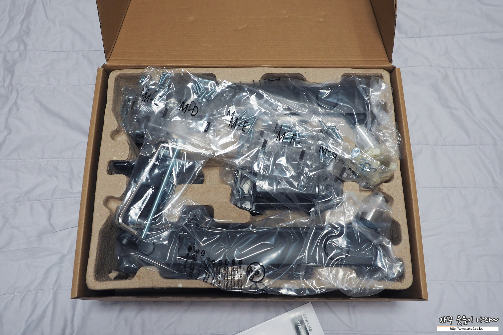 별도늬 VESA 판이 제공되며, 보유한 모니터에 맞게 다양한 나사가 제공됩니다. 베사 규격은 75x75, 100x100을 지원하고 있습니다. 아마도 베사홀이 지원되는 대부분의 모니터에 장착이 가능할 듯...