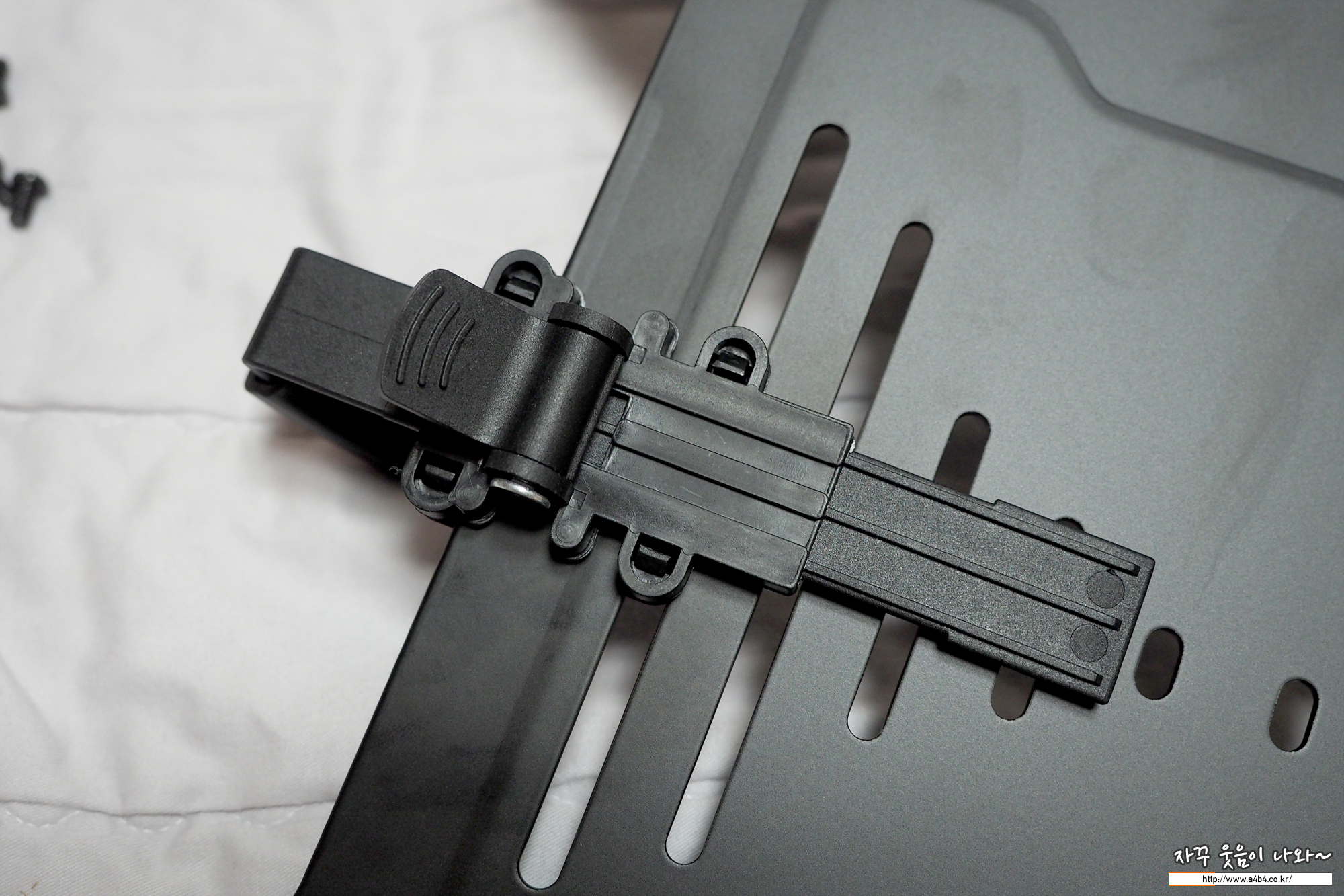노트북 고정바는 이렇게 노트북 거치대와 연결합니다. 상하 이동이 가능해서 노트북 좌우측의 HDMI나 USB, DS 메모리 슬롯을 가리지 않고 위치 고정이 가능합니다.