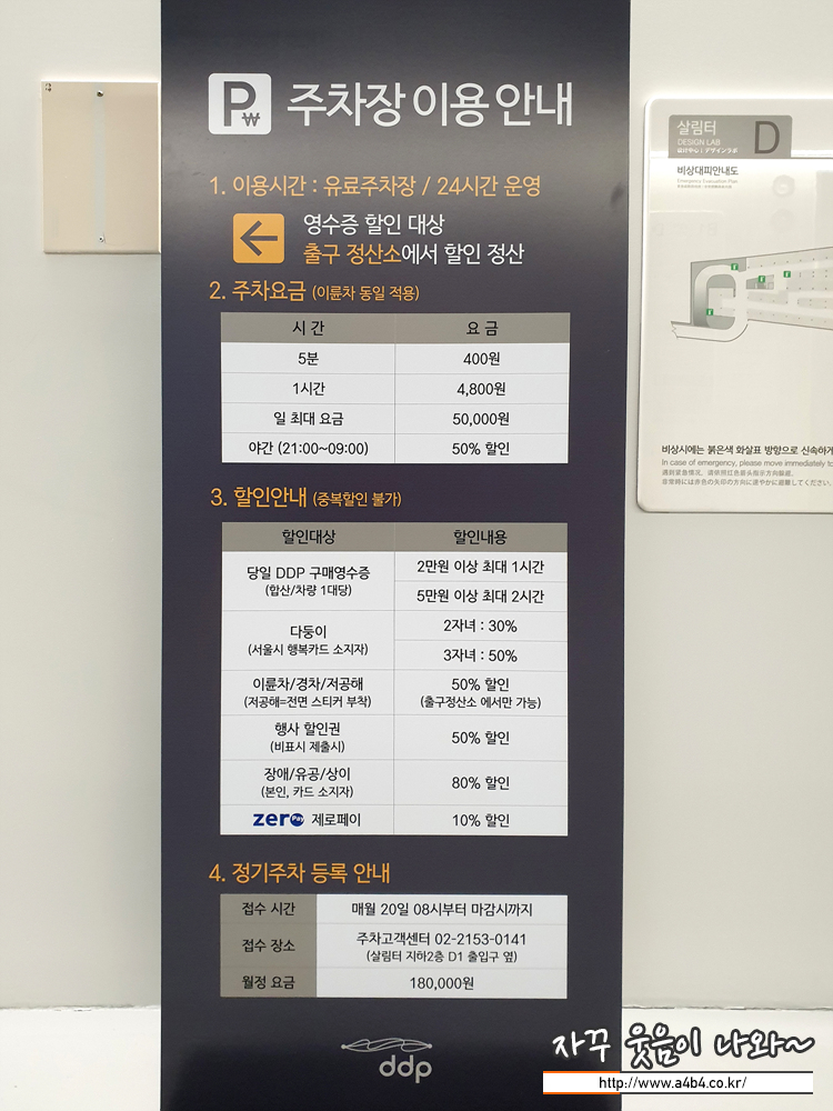 전 1층에 주차하고 또 한 층을 올라갔네요. 주차요금은 아래와 같으며, 2만원 이상 티켓이 있으면 출차시 주차할인 가능합니다. 한 시간에 정장 주차요금은 4,800원입니다. 적은 금액은 아니네요. DDP에서 5만원 이상 구입하면 최대 2시간 할인이 가능하지만, 2시간이면 이번 살바도르 달리전 관람하기에 조금 부족한 시간으로 생각됩니다.