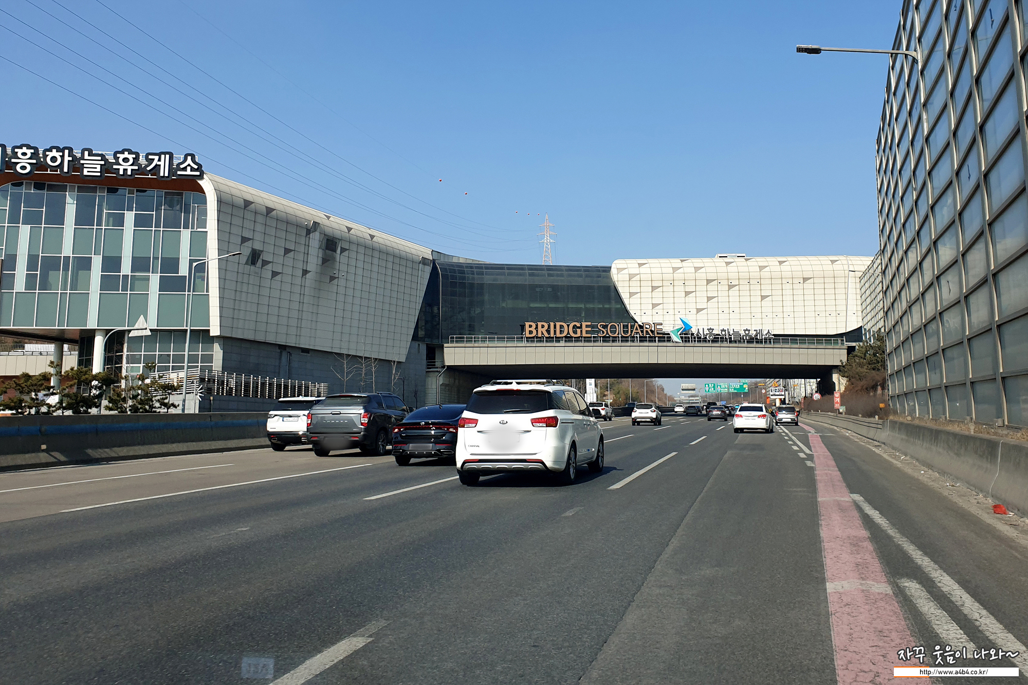 시흥하늘휴게소 브릿지 스퀘어는 '수도권제1순환고속도로 105지점'에 위치흔 고속도로 휴게소입니다. 사진과 같이 휴게소가 고속도로 상하행선으로 분리되어 있지 않고, 본선 상공에 건설된 브릿지 스퀘어를 통해 구분 없이 이용이 가능하도록 구성되어 있습니다.