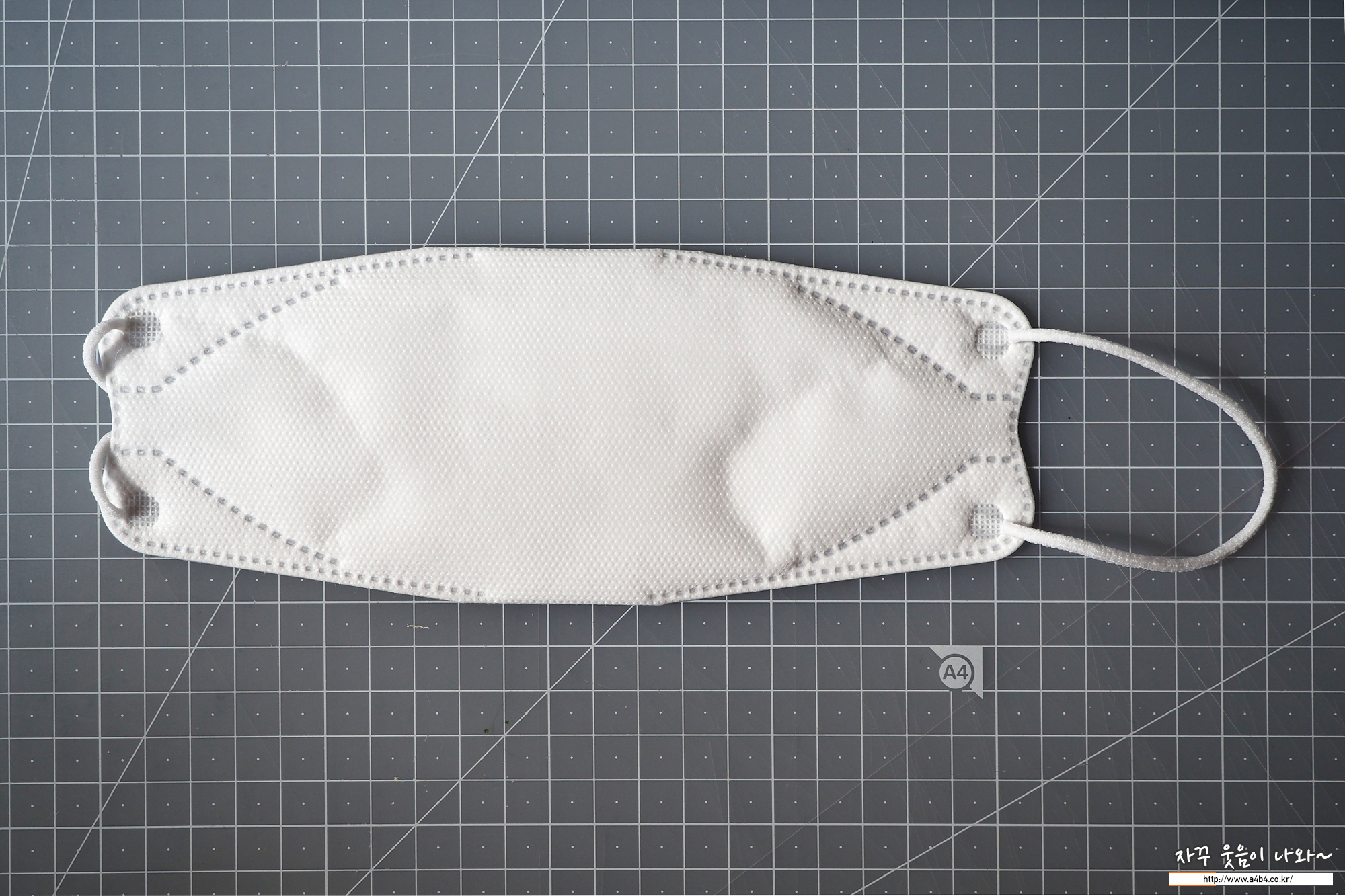 마스크 앞에는 둥근 모양의 귀걸이끈이 부착되어 있습니다. 귀걸이끈 접착상태는 양호하며 탄력은 약간 강한 타입니다. (좀 짱짱한)