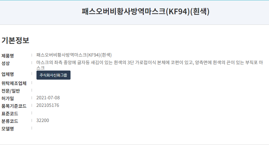 식약처에 등록된 제품명은 '패스오버황사방역마스크'입니다. 패키지에 표시된 '위머스트엠 마스크'와는 다른 이름을 보여주고 있습니다. KF94 타입으로 사이즈는 대형, 컬러는 흰색입니다. 20년 8월 허가된 마스크로 제조원은 '(주)신화그룹'입니다.