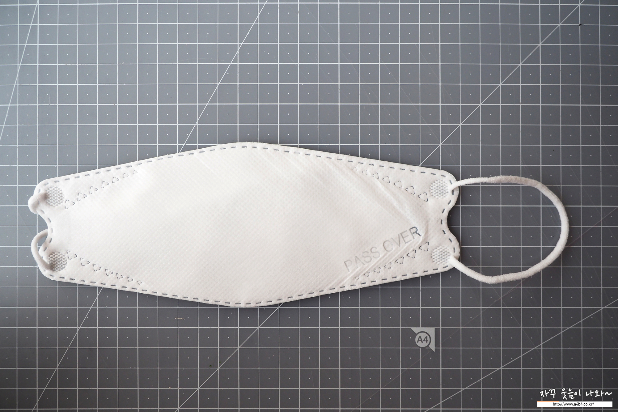 마스크 전면에는 식약처 등록명칭은 패스오버가 영문으로 음각되어 있습니다. 패키지서 신혜선씨가 착용한 제품과는 디자인과 문양이 전혀 다르네요.