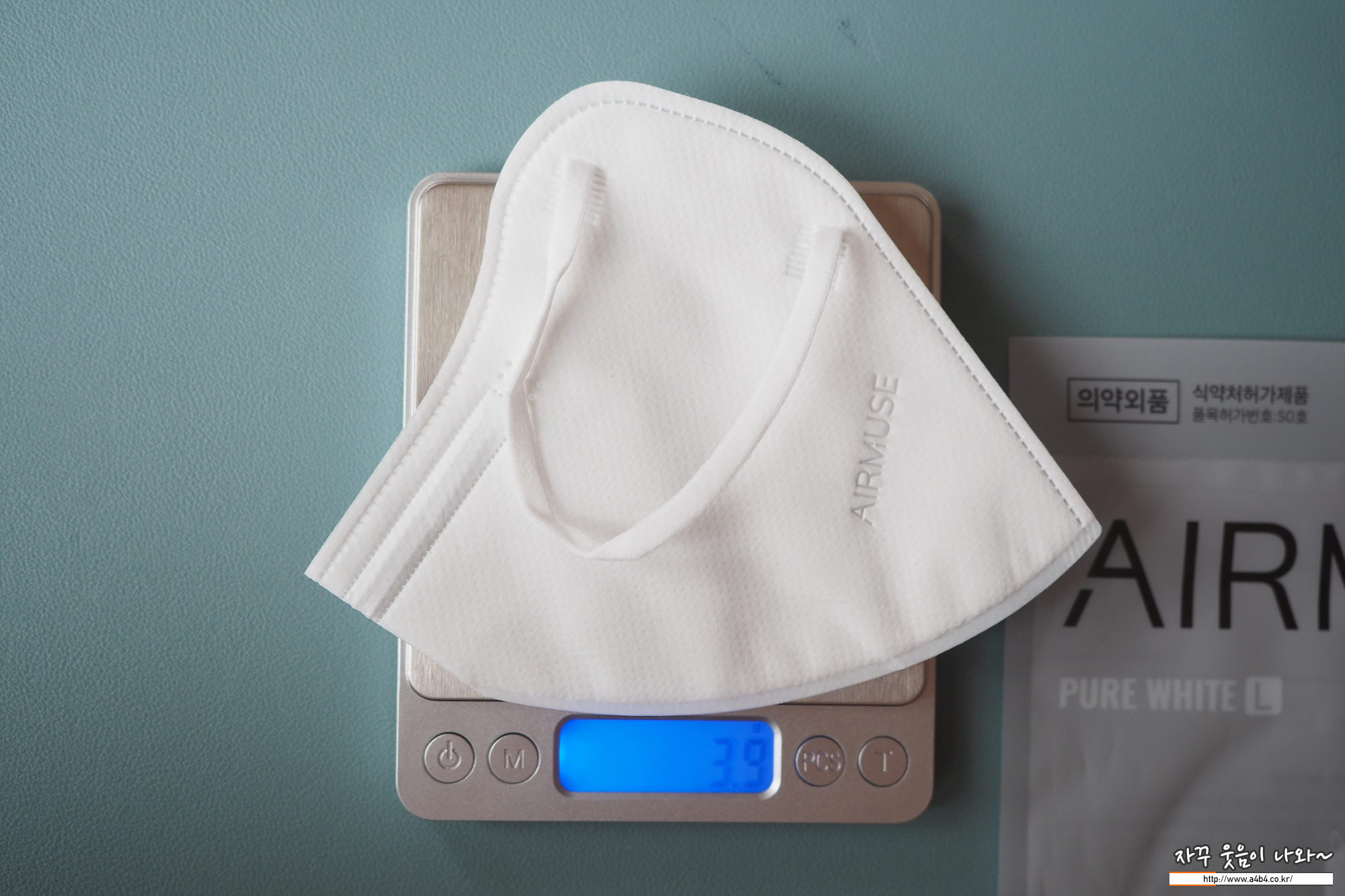 KF94 에어뮤즈 마스크 대형 중량은 3.9그램으로 타사 대형 새부리 마스크에 비해 조금 가벼운 중량을 보여줍니다.