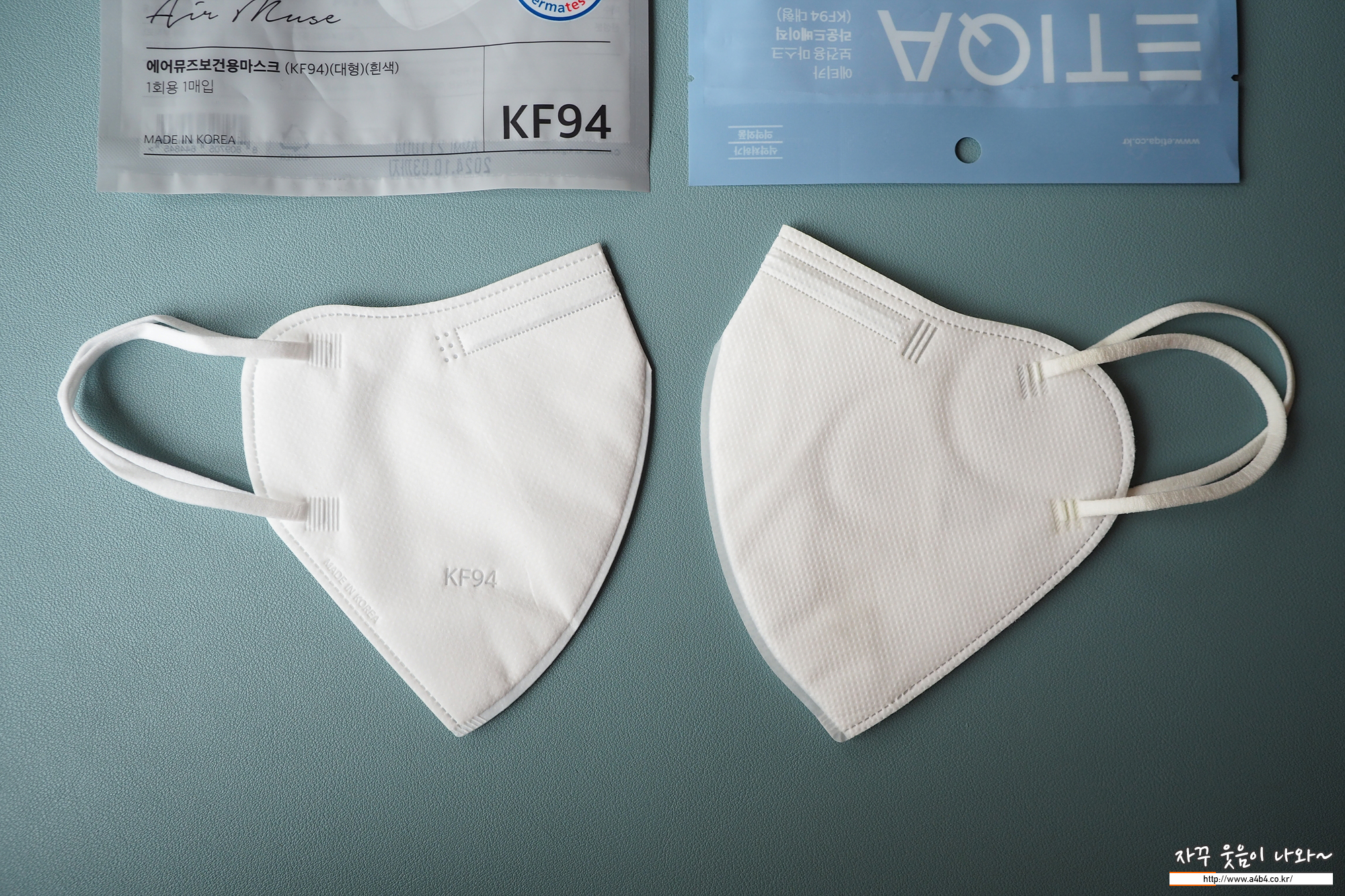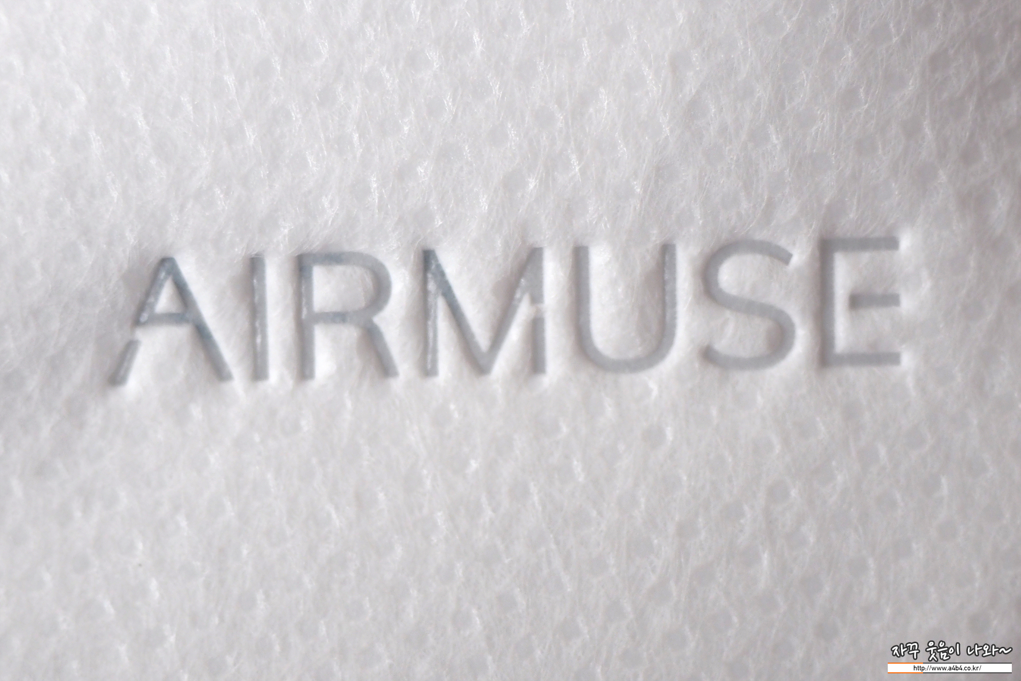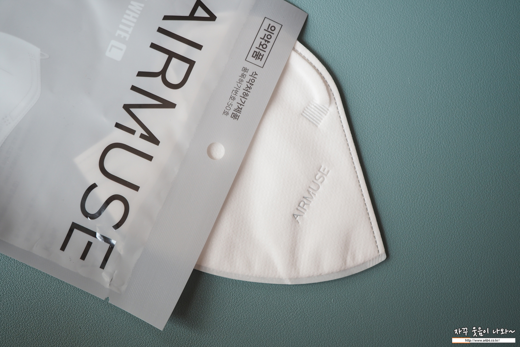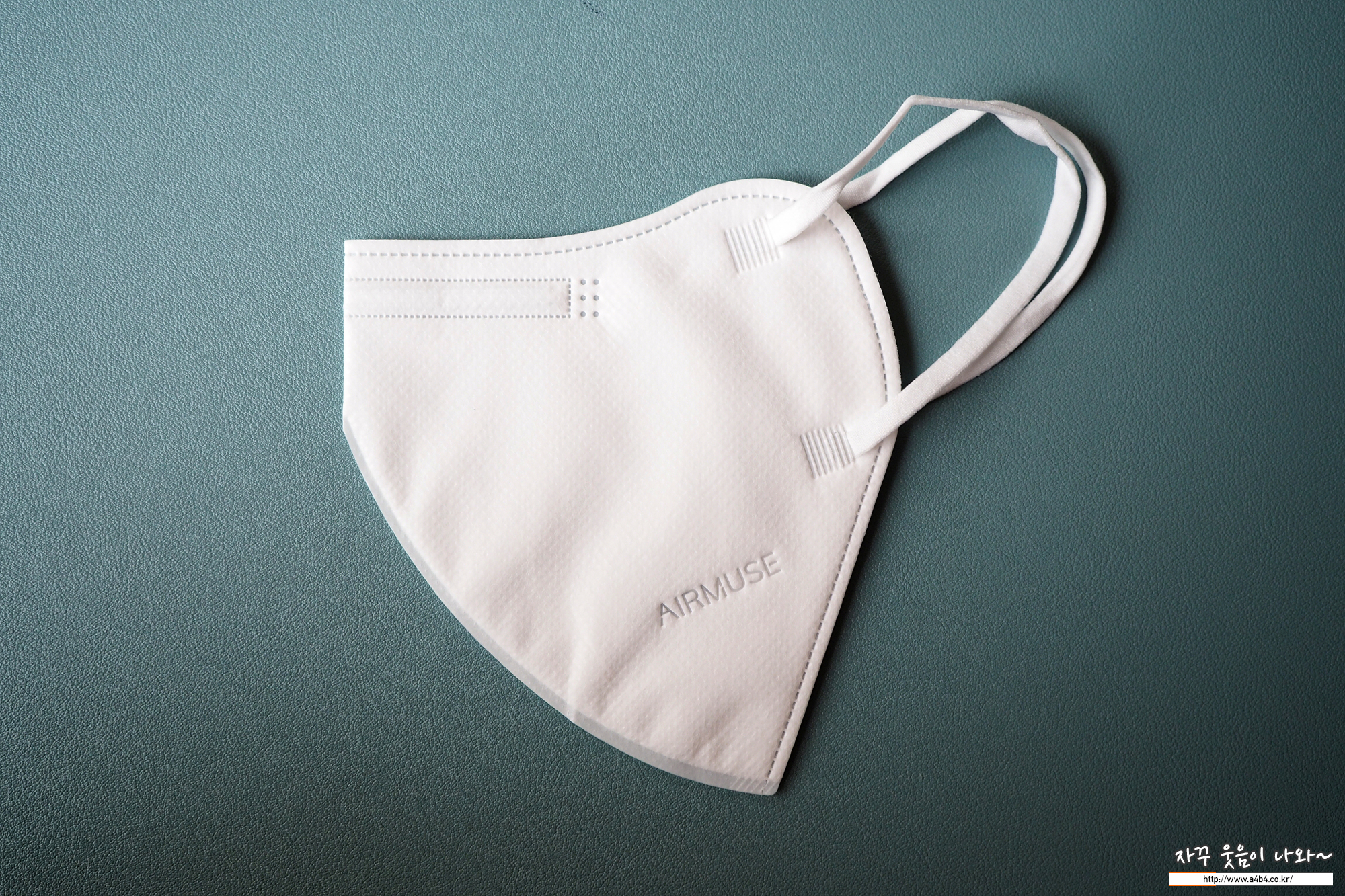 마스크 디자인은 세로 이단접이 새부리형 디자인을 보여주며, 큰 디자인 특징은 없습니다. 마스크 앞부분에 제품명인 AIRMUSE가 음각되어 있으며, 한 쪽에는 보건용마스크 타입인 KF94 글씨도 음각되어 있습니다.