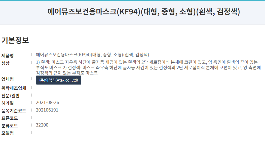 식약처에 등록된 제품명칭은 '에어뮤즈 보건용마스크 KF94'입니다. 사이즈는 대형, 중형, 소형이 등록되어 있으며, 마스크 컬러는 화이트와 블랙 색상이 있습니다. 작년인 21년 8월 허가된 마스크로 제조원은 '주식회사 아텍스'로 등록되어 있습니다. '에어뮤즈'라는 브랜드로 보건용마스크와 공산품 컬러마스크를 생산하고 있습니다.