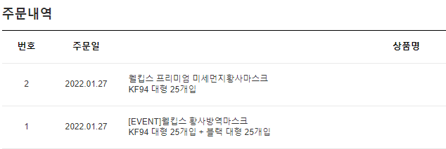시작은 1월 27일 웰킵스몰에서 아래와 같이 웰킵스 마스크 2박스씩 2회 결제를 진행. 주문 완료!!!