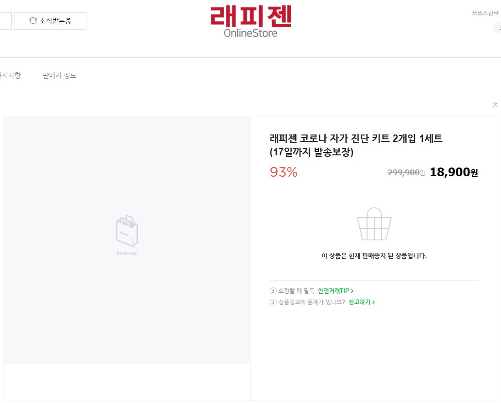 현재는 시중에서 구할 수 없는 제품입니다. 정부의 코로나 자가진단키트 온라인 판매 금지 직전에 구입한 제품입니다. 당시만 해도 개당 7천 원 중반가격 이었는데, 막판에는 9천원 중반까지 오르더군요. (배송비 별도) 그것도 레피젠 네이버 온라인스토어에서... (공식 몰인 것 같기도? 위탁 몰인것 같기도?)