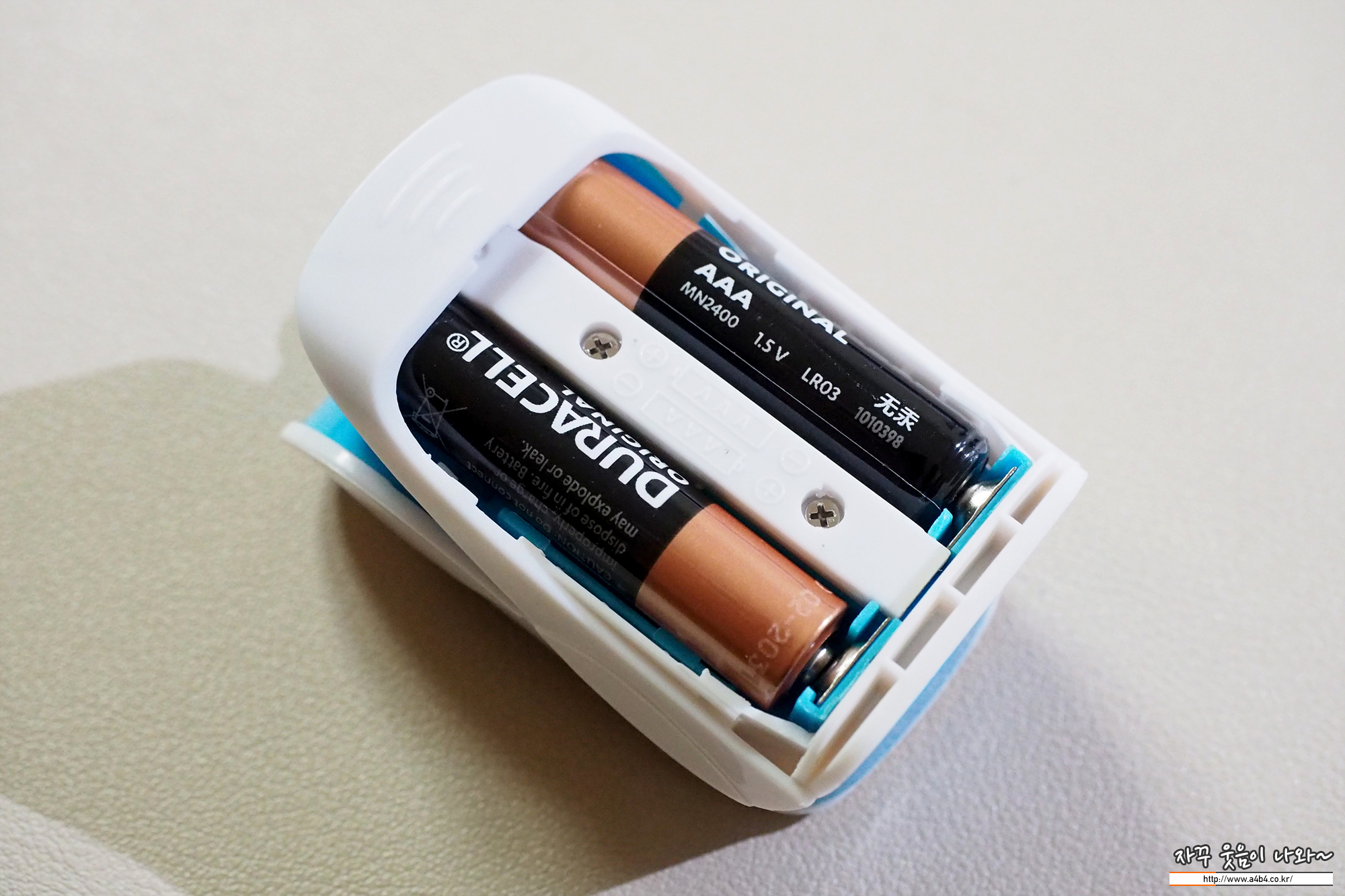 사진과 같이 AAA형 배터리 2개가 들어갑니다. + - 극은 같은 방향으로 되어 있지만 배터리 2개가 반대 방향으로 삽입해야 합니다. 역시나 저렴이 중국산 산소포화도 측정기...