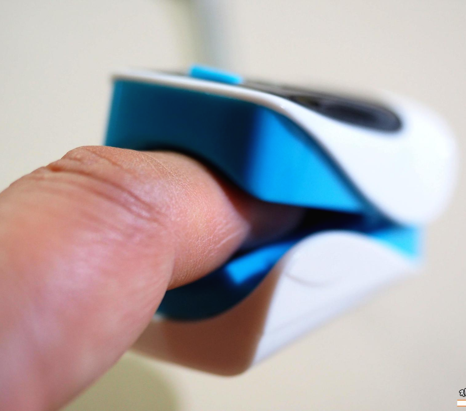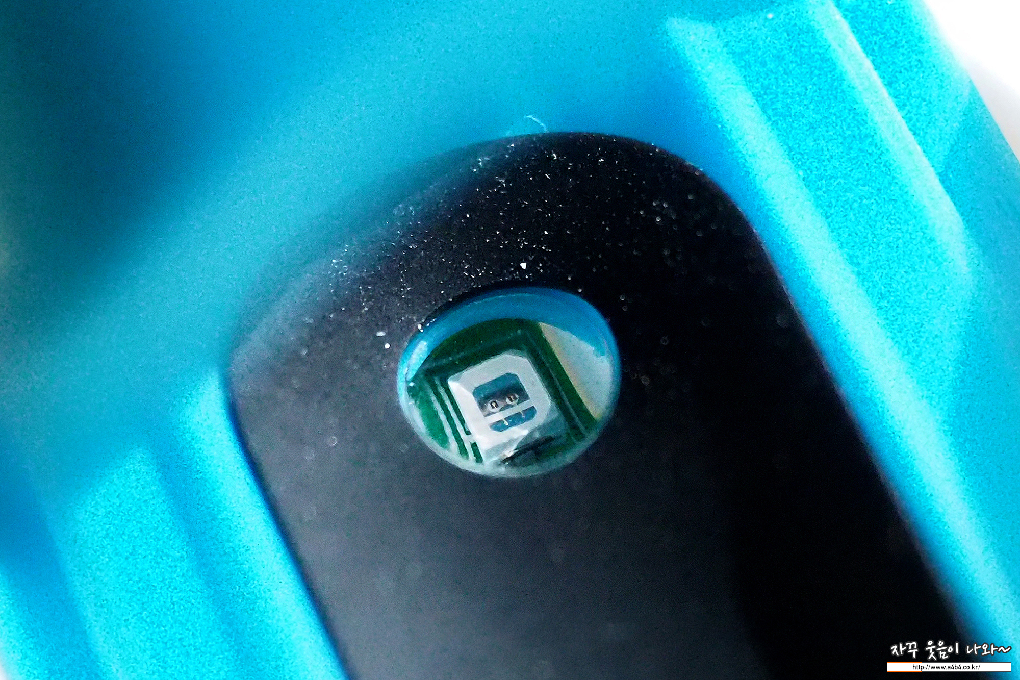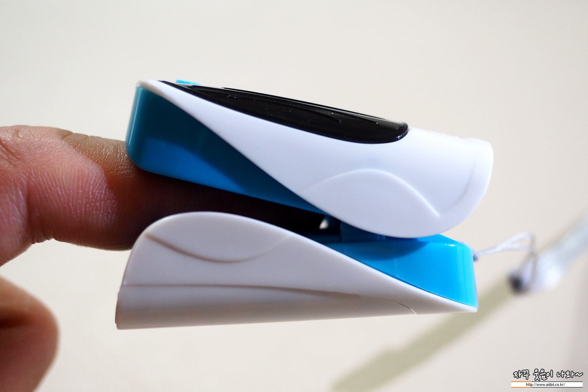 저가 산소포화도 측정기로 완성도나 디자인은 좀 아쉬운 부분이 많습니다. 불량 장난감 같은 색상과 조금은 불안한 집계. 안쪽에는 측정위한 광센서가 위치해 있습니다.