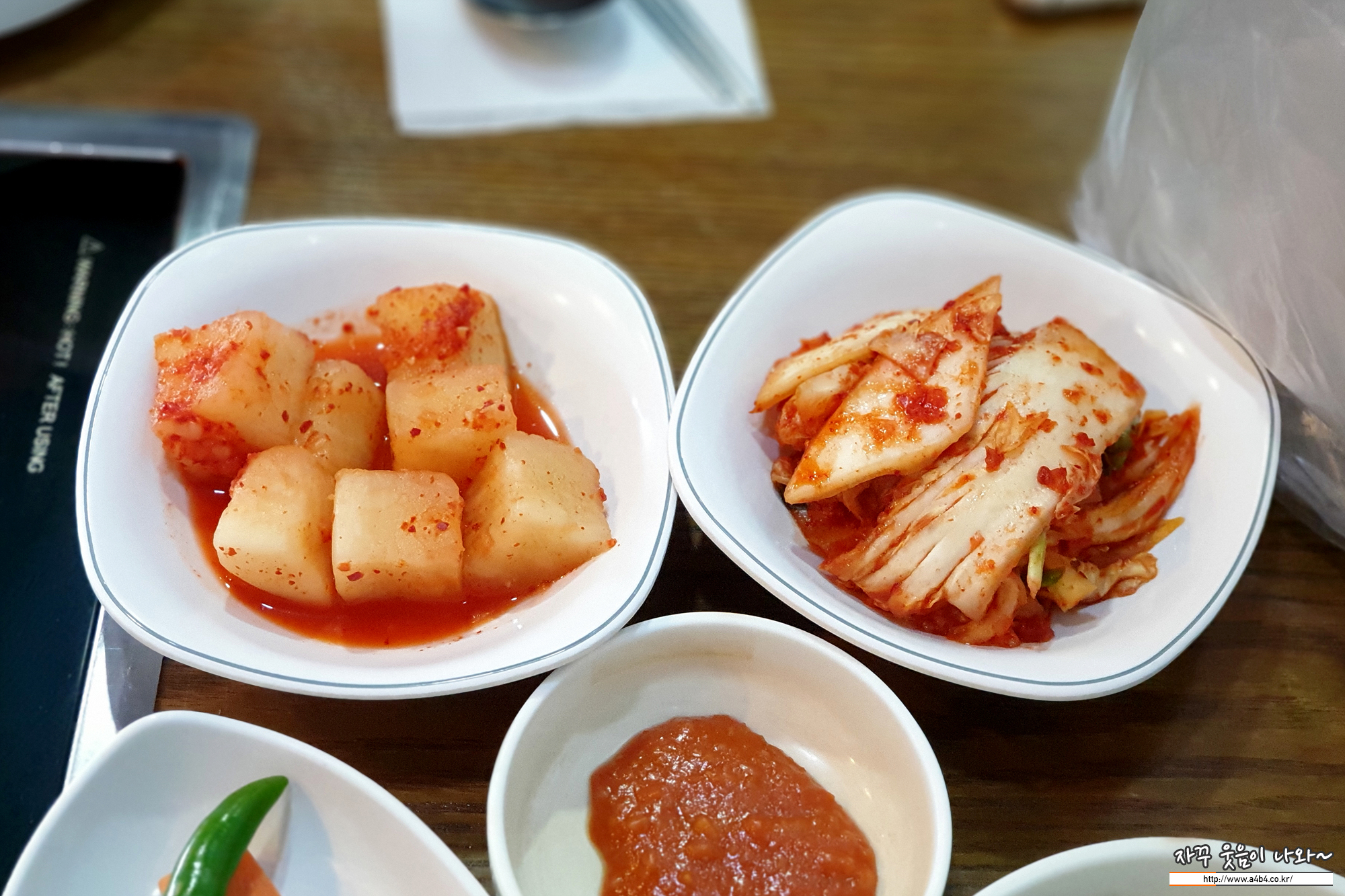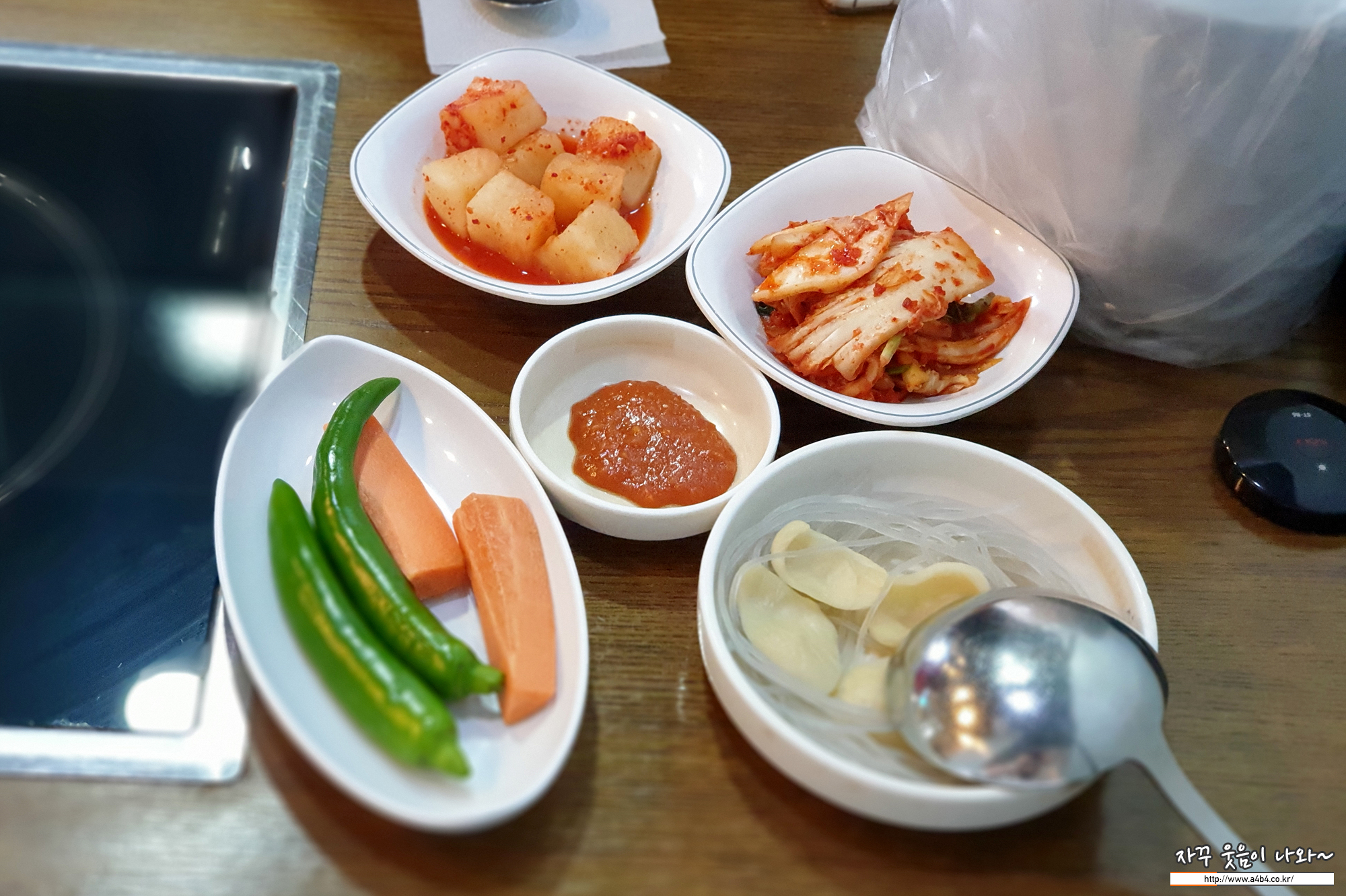 기본 반찬은 이렇게 나오고요. 반찬들은 한 켠에서 셀프로 리필 가능합니다.