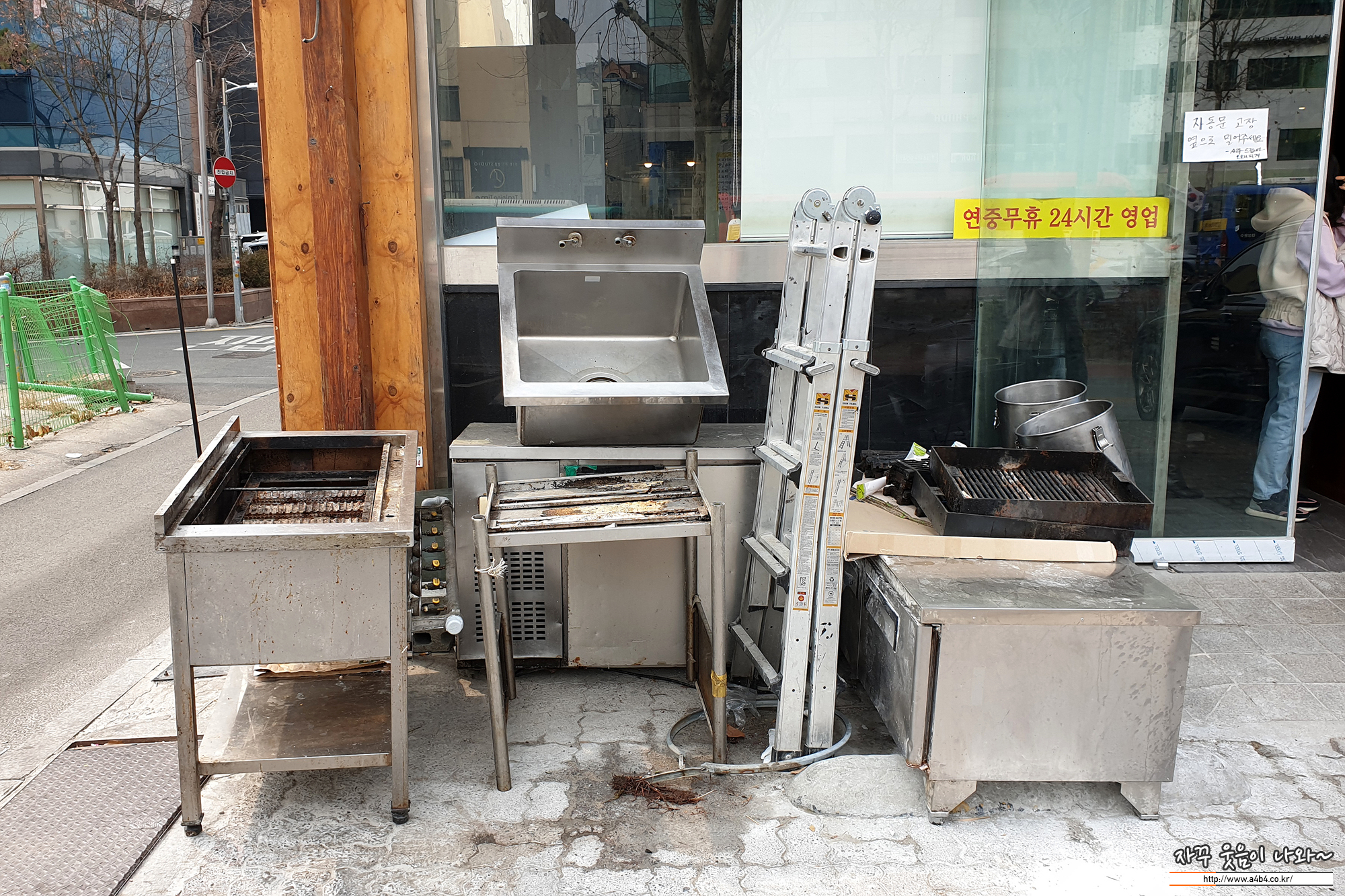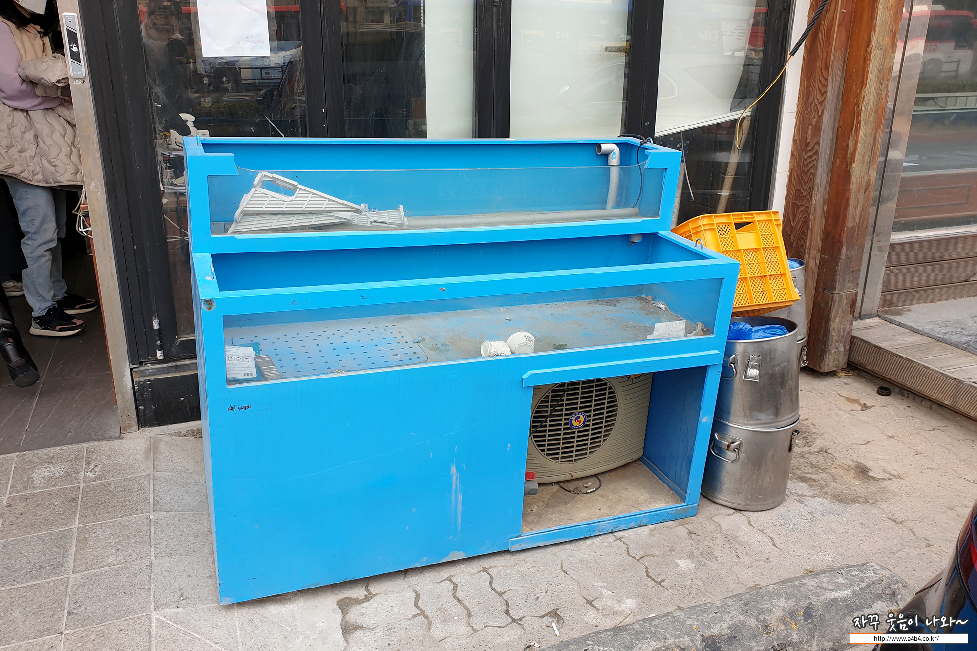 식당 입구에는 예전 살아있는 바지락이 있던 수조도 먼지가 쌓인채로 방치되어 있고, 못쓰는 주방기구도 이렇게 나뒹굴고 있네요. 아마 걸어서 정문으로 왔다면 들어가지 않았을 것 같네요.